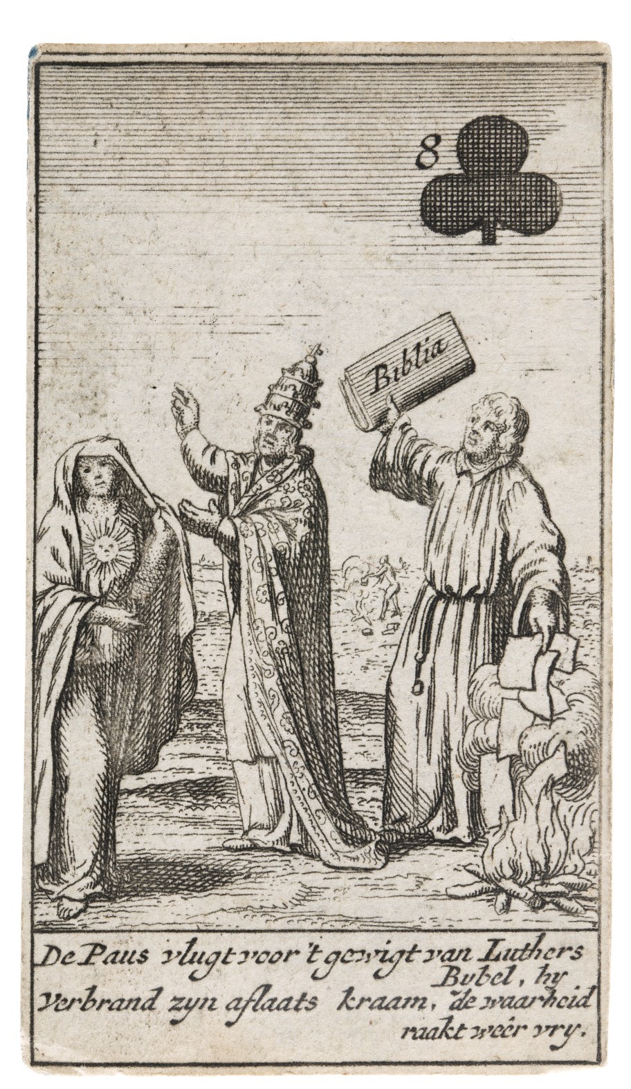 Kaartspel: Klaver acht; De paus vlugt voor 't gewigt van Luthers bijbel, ...