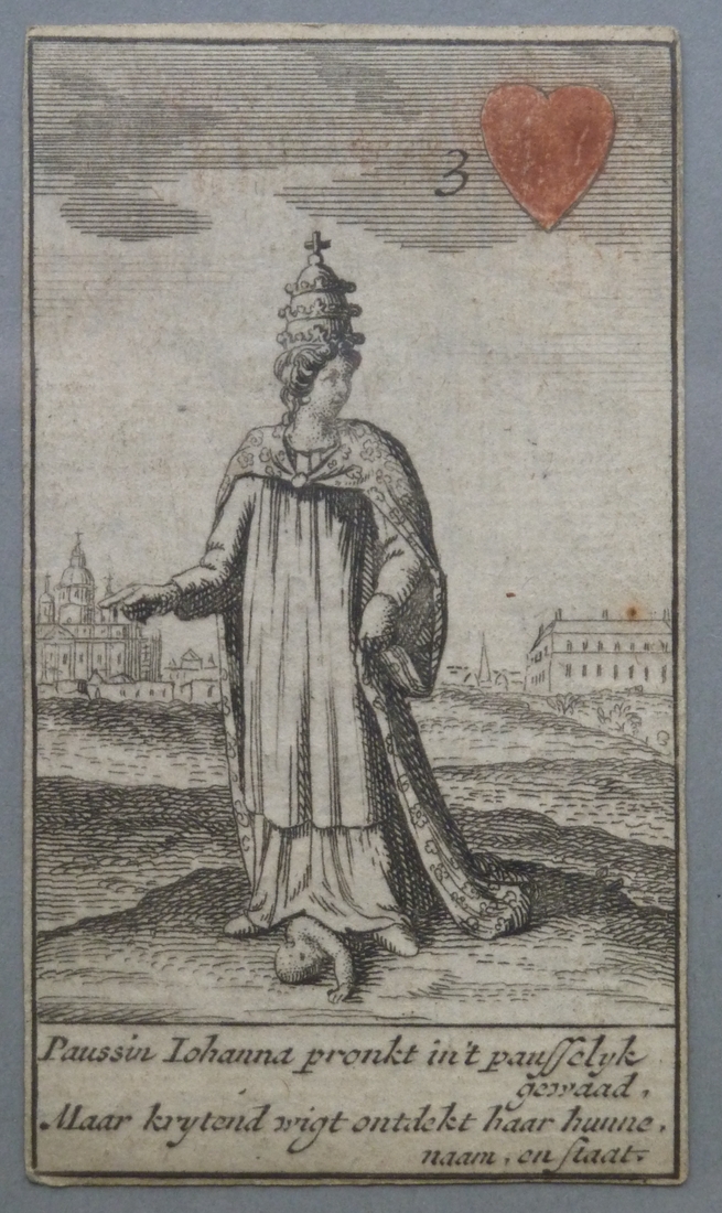 Kaartspel: Harten drie; Paussin Johanna pronkt in 't pausselijk gewaad, ...