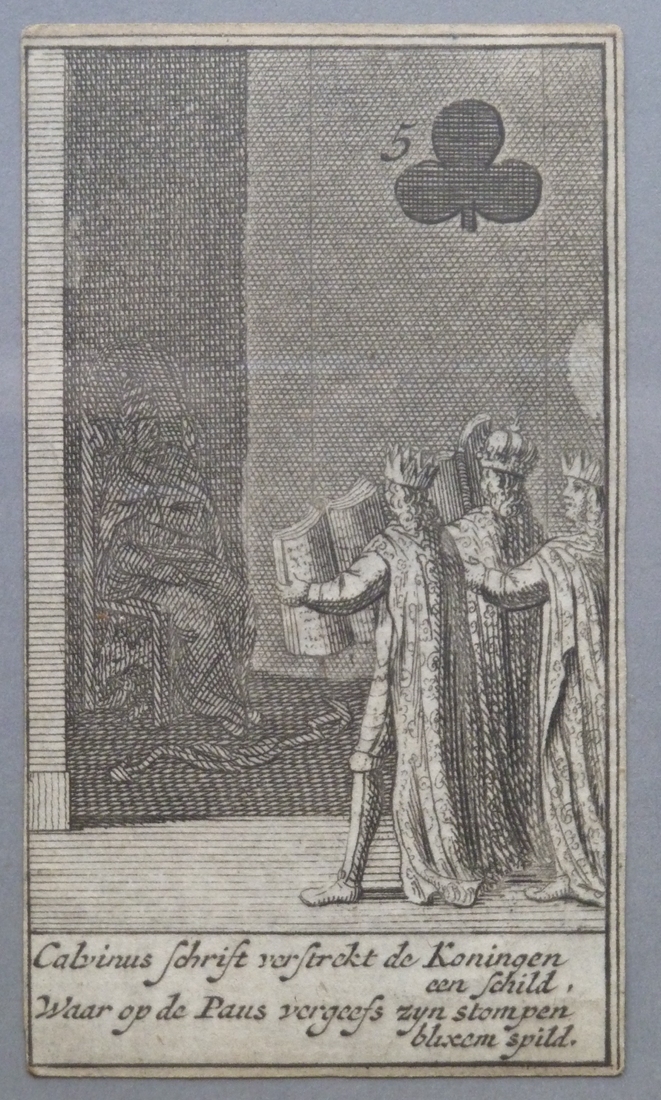 Kaartspel: Klaver vijf; Calvinus schrift verstrekt de koningen een schild, ...