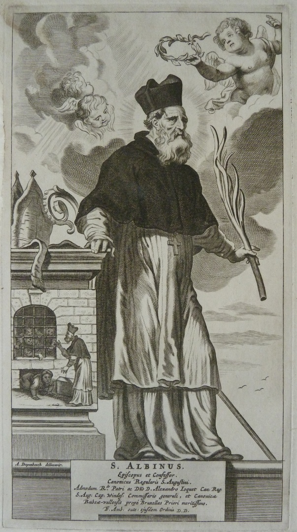 St. Albinus, met palmtak, leunt op stenen blok met afbeelding bevrijding gevangenen