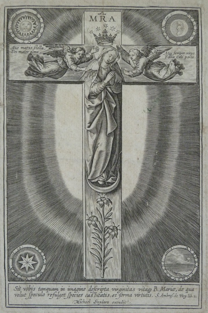 Maria op een kruis met in de armen van het kruis twee engelen