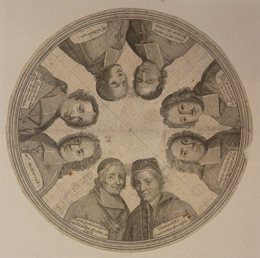 Tourniquetspel waarop afgebeeld enige hoofdpersonen uit de strijd om de bul "Unigenitus"