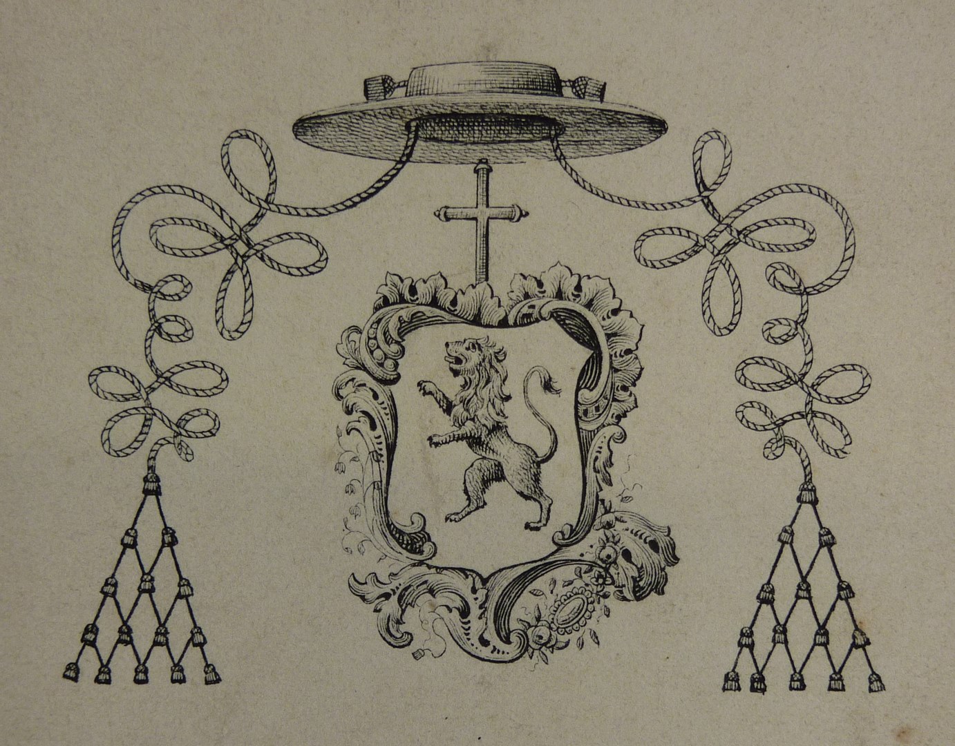 Wapen bekroond met kardinaalshoed, met staande leeuw naar links