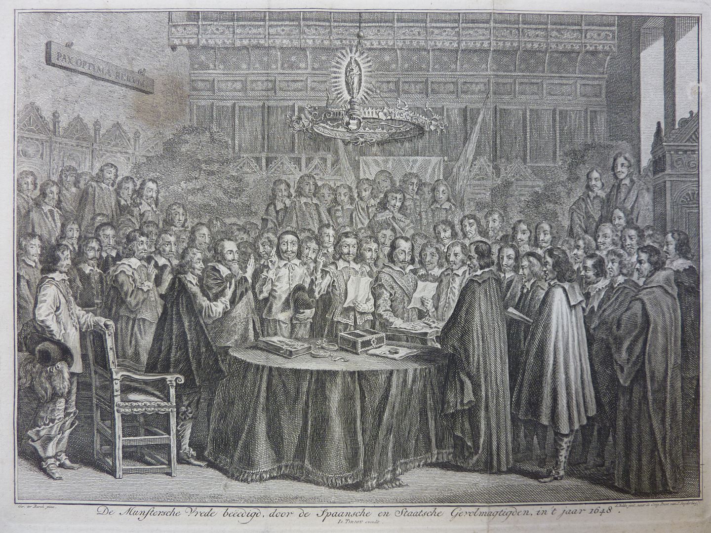 De Munstersche vrede beëedigd, door de Spaansche en Staatsche gevolmagtigden, in 't jaar 1648