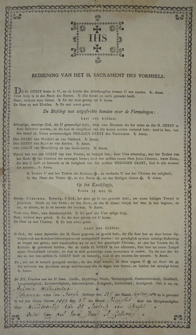 Bediening van het H. Sacrament des vormsels ... Antonia ... Johanna van den Bergh ... Utrecht ...