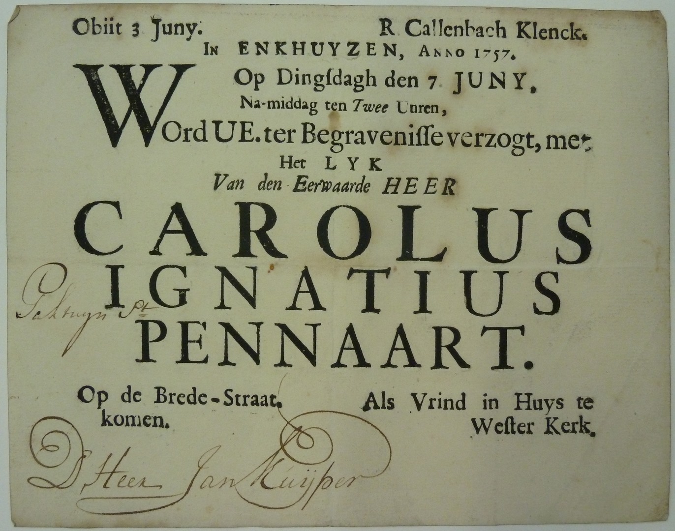 Obiit 3 juny ... ter begrafenisse verzogt, met het lijk van Carolus Ignatius Pennaart ...