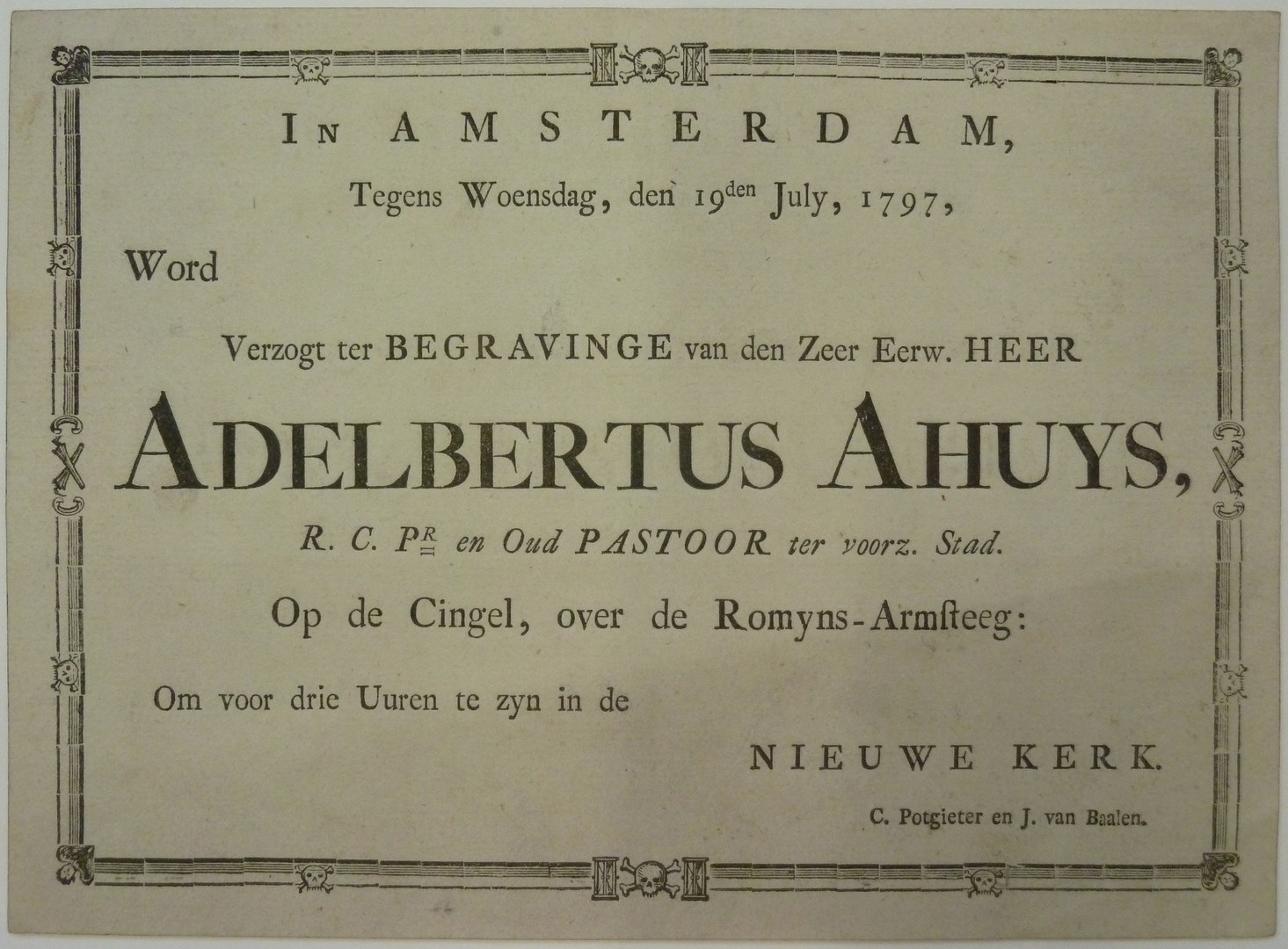 In Amsterdam ... verzogt ter begravinge ... Adelbertus Ahuys ...
