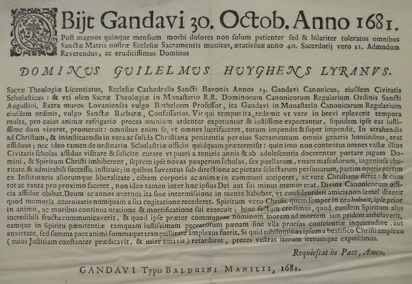 Obiit Gandavi ... Dominus Guilelmus Huyghens Lyranus ...