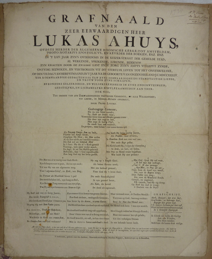 Grafnaald ... Lukas Ahuys, oudste herder der algemeene roomsche kerke tot Amsteldam, ...