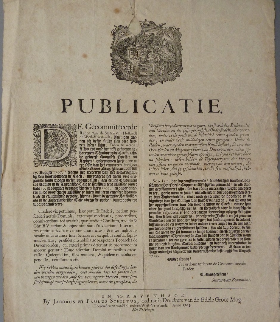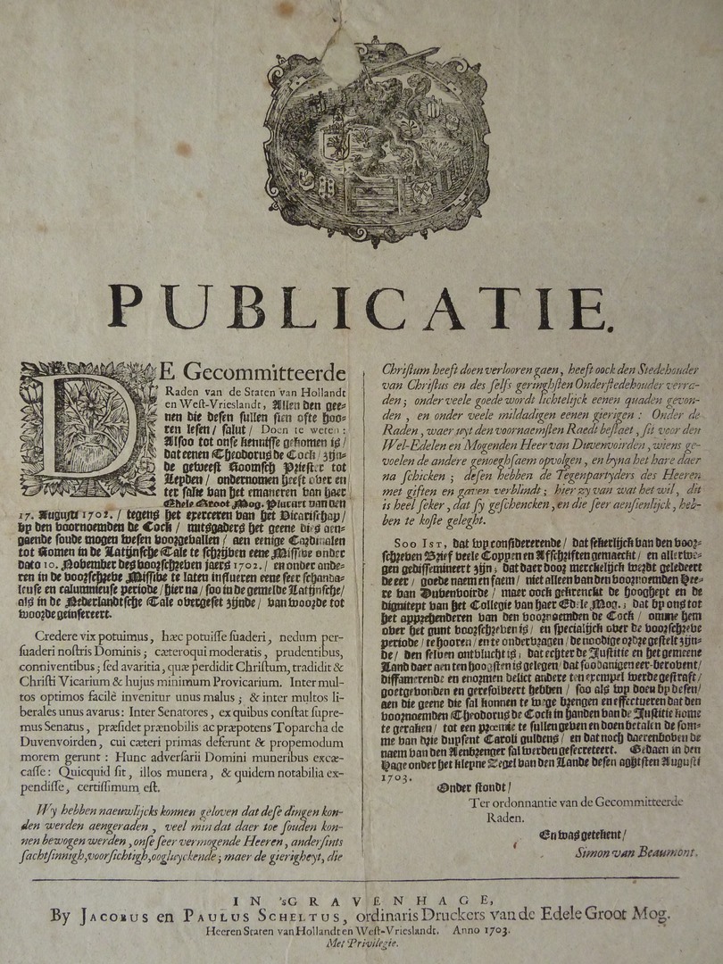 Publicatie. De gecommitteerde raden van de staten van Hollandt ... Theodorus de Cock ...