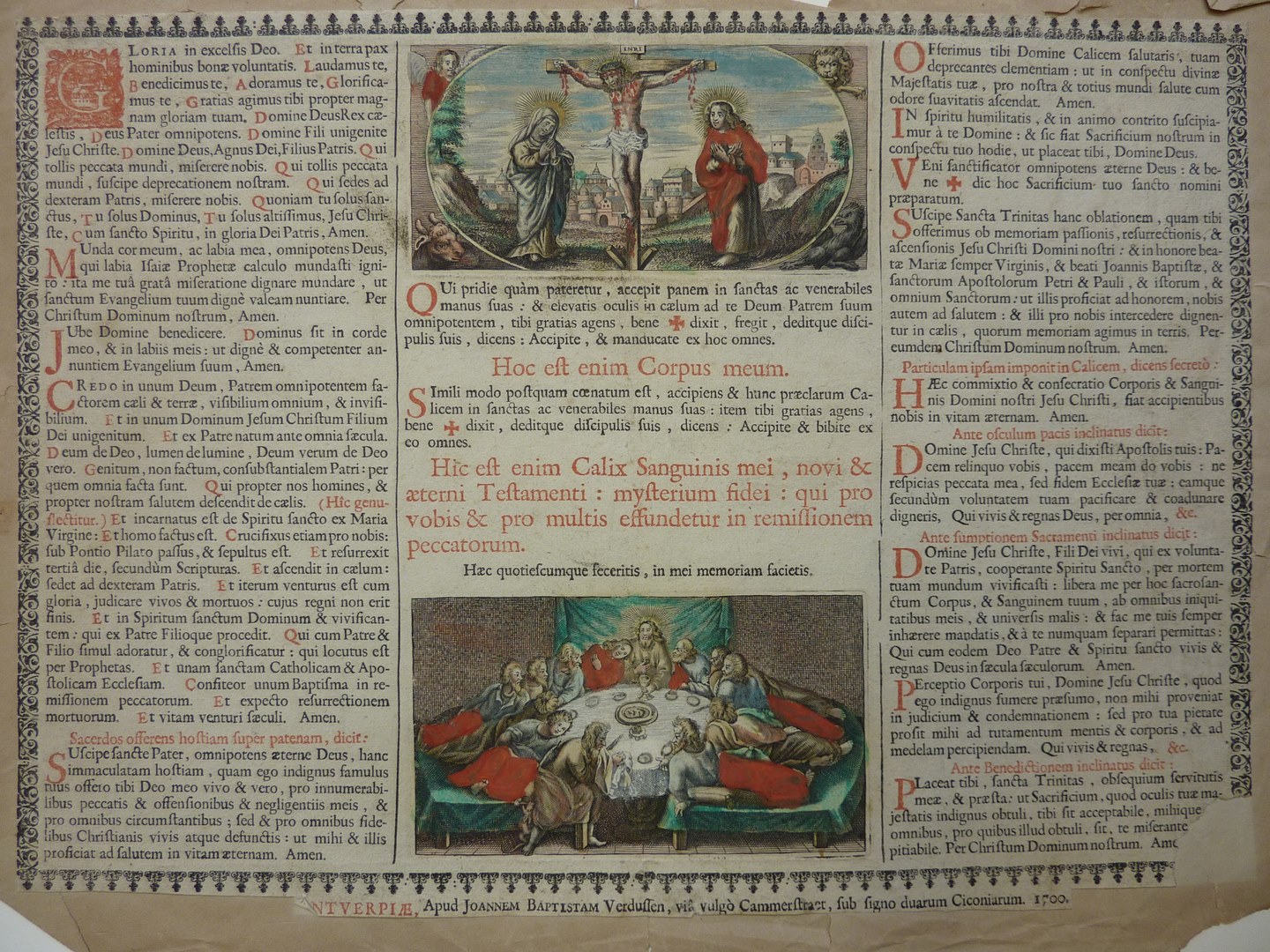 Tekstblad met illustraties van gekruisigde Christus en het laatste avondmaal, ingekleurd