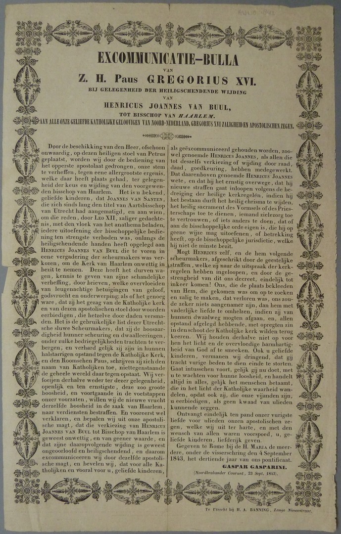 Excommunicatie-bulla van Z.H. paus Gregorius XVI ... heiligschendende wijding van Henricus Joannes van Buul, tot bisschop van Haarlem ...