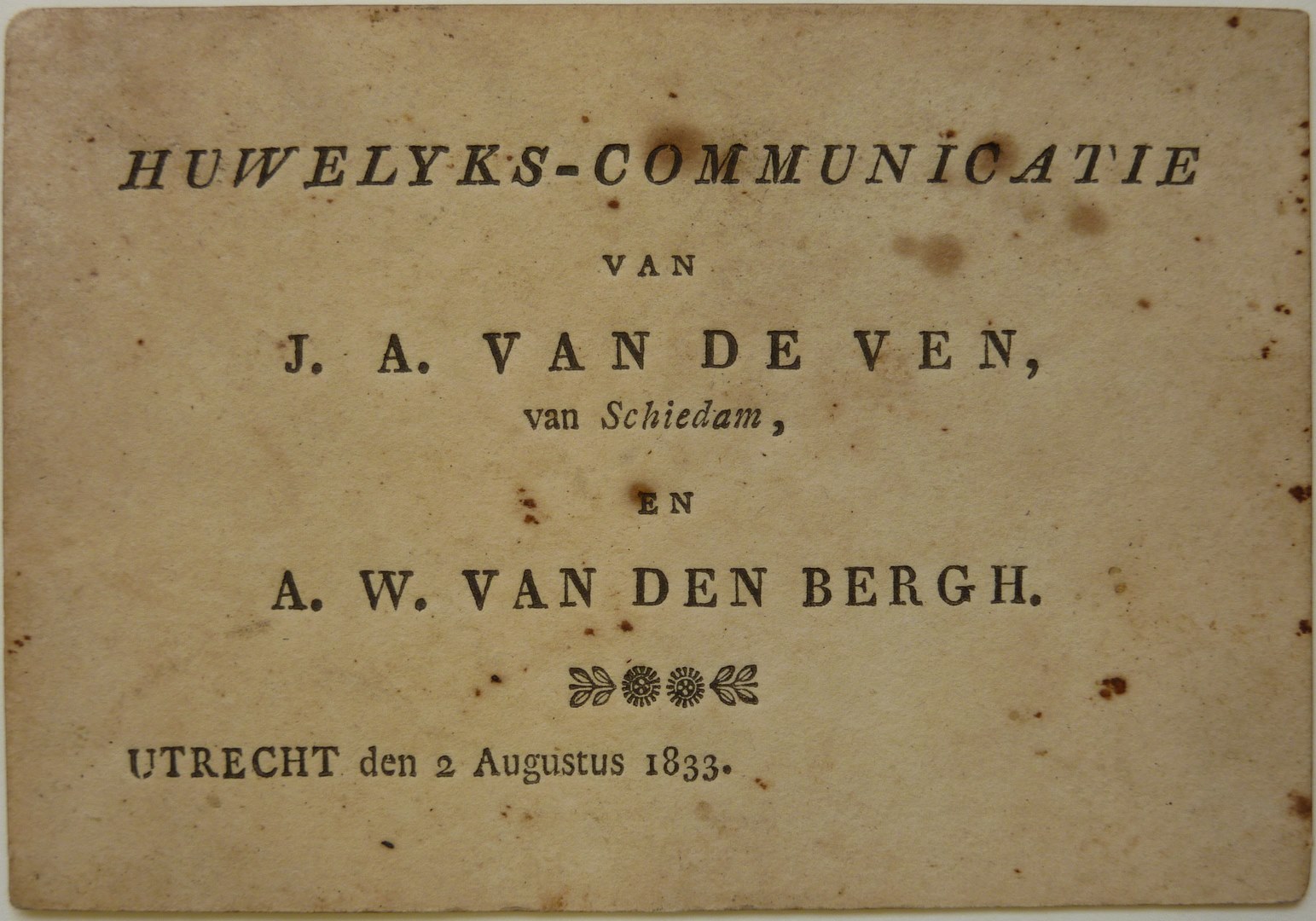 Huwelijks-communicatie van J.A. van de Ven, van Schiedam, en A.W. van den Bergh
