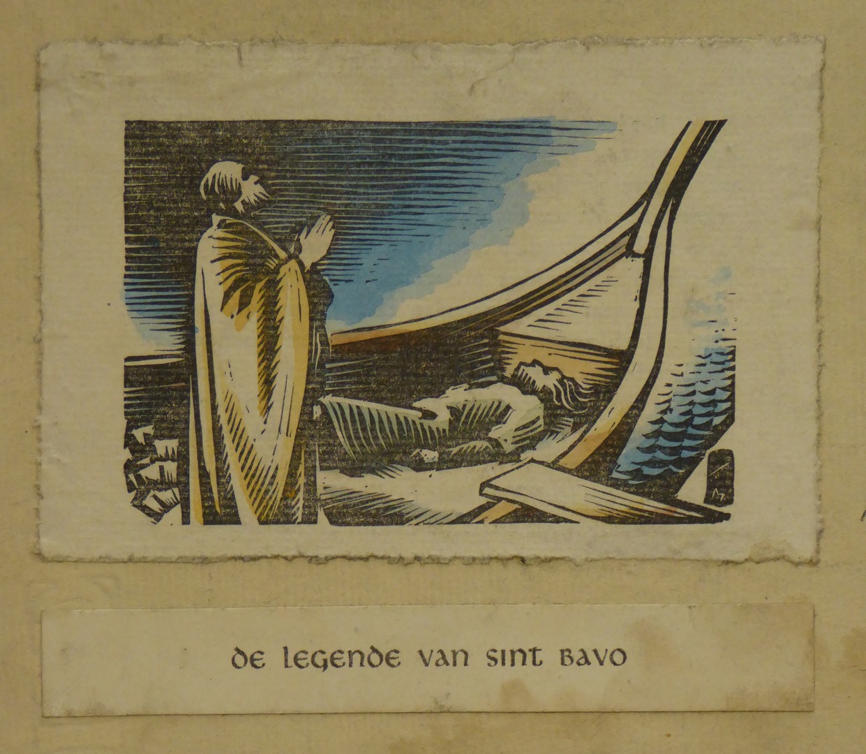 Houtsneden uit Helden Gods van E. Lagerwey (serie): De legende van St. Bavo, ingekleurd
