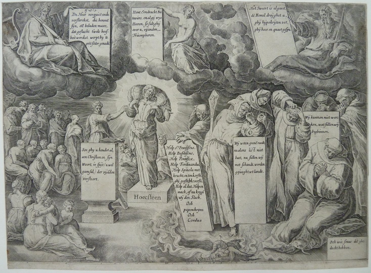 Spotprent op de katholieken na hun verliezen in 1627 en 1629. Opschriften verwijzen naar Spinola, Ferdinand, Pappenheim en Cordua. Christus draagt het lam op zijn schouders als de goede herder, staande op de hoeksteen. Bij hem een predikant en het volk. Rechts treurende katholieke priesters en monniken. Aan hun voeten het hellevuur en de kop ...
