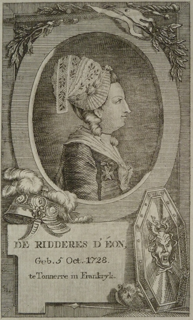 Portret van ridder d'Eon (1728-1810), Frans geheim agent voor de koning, als vrouw verkleed