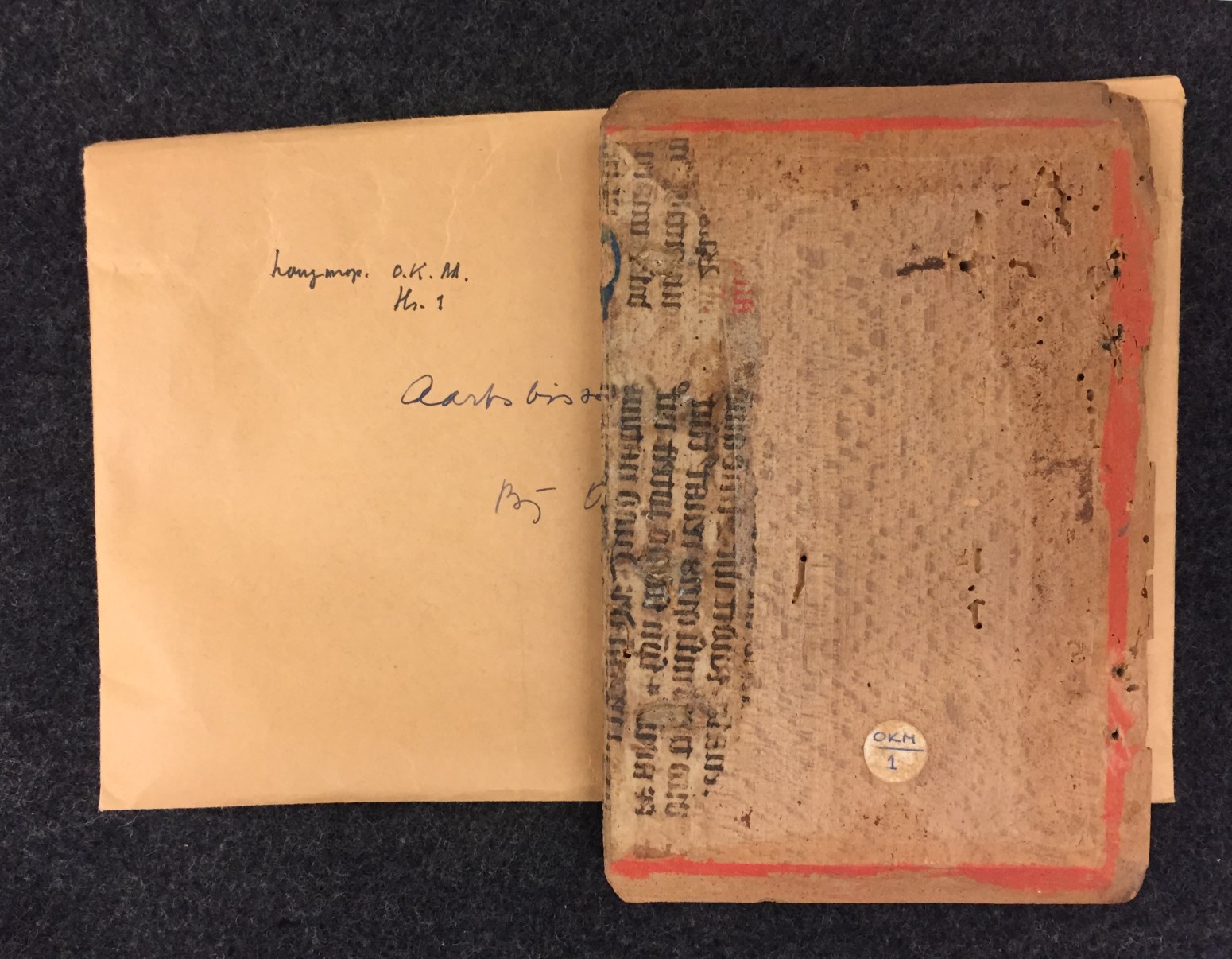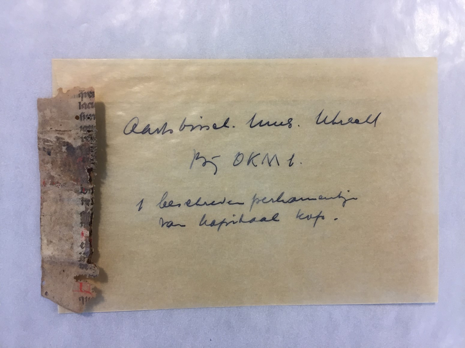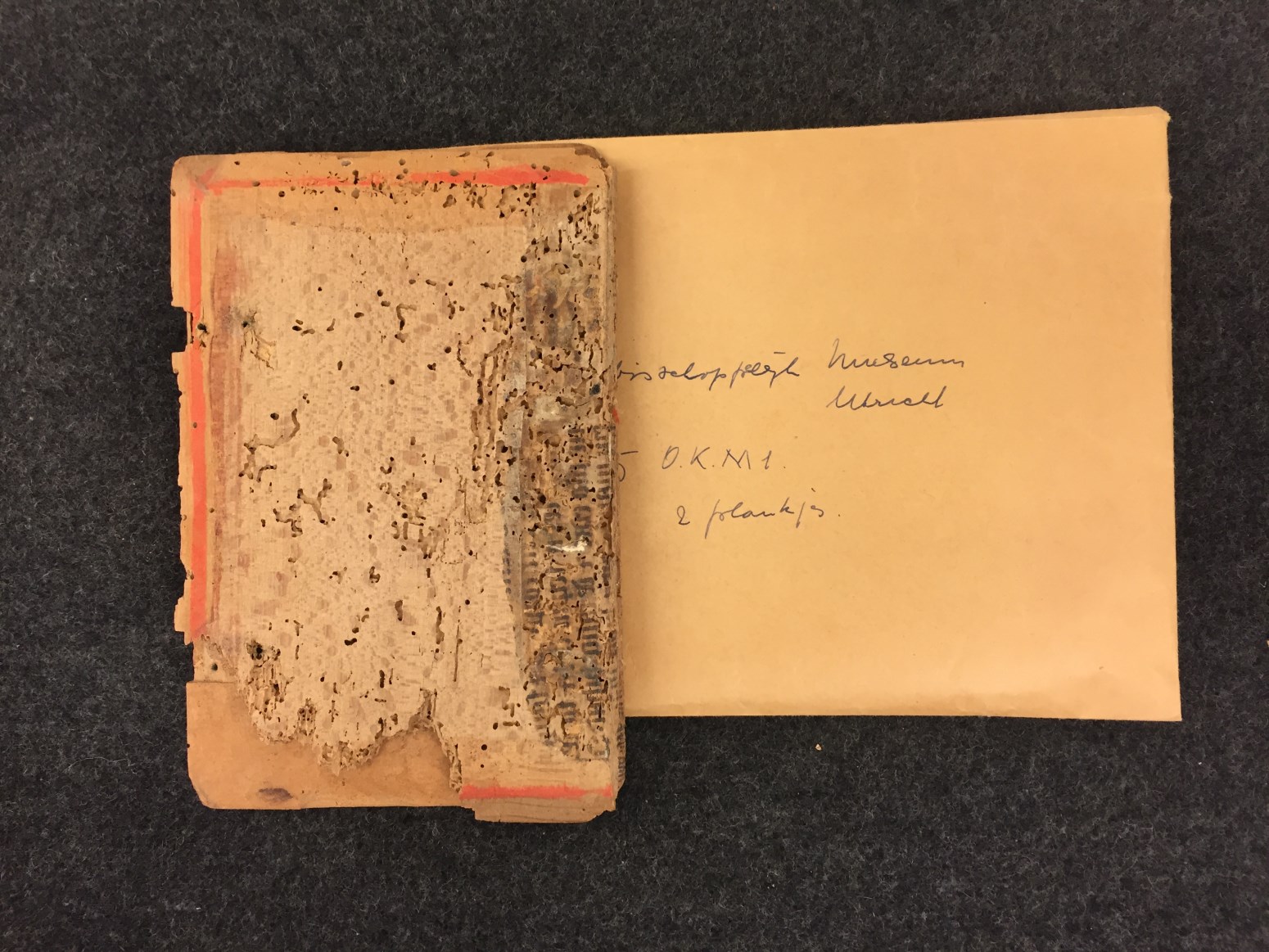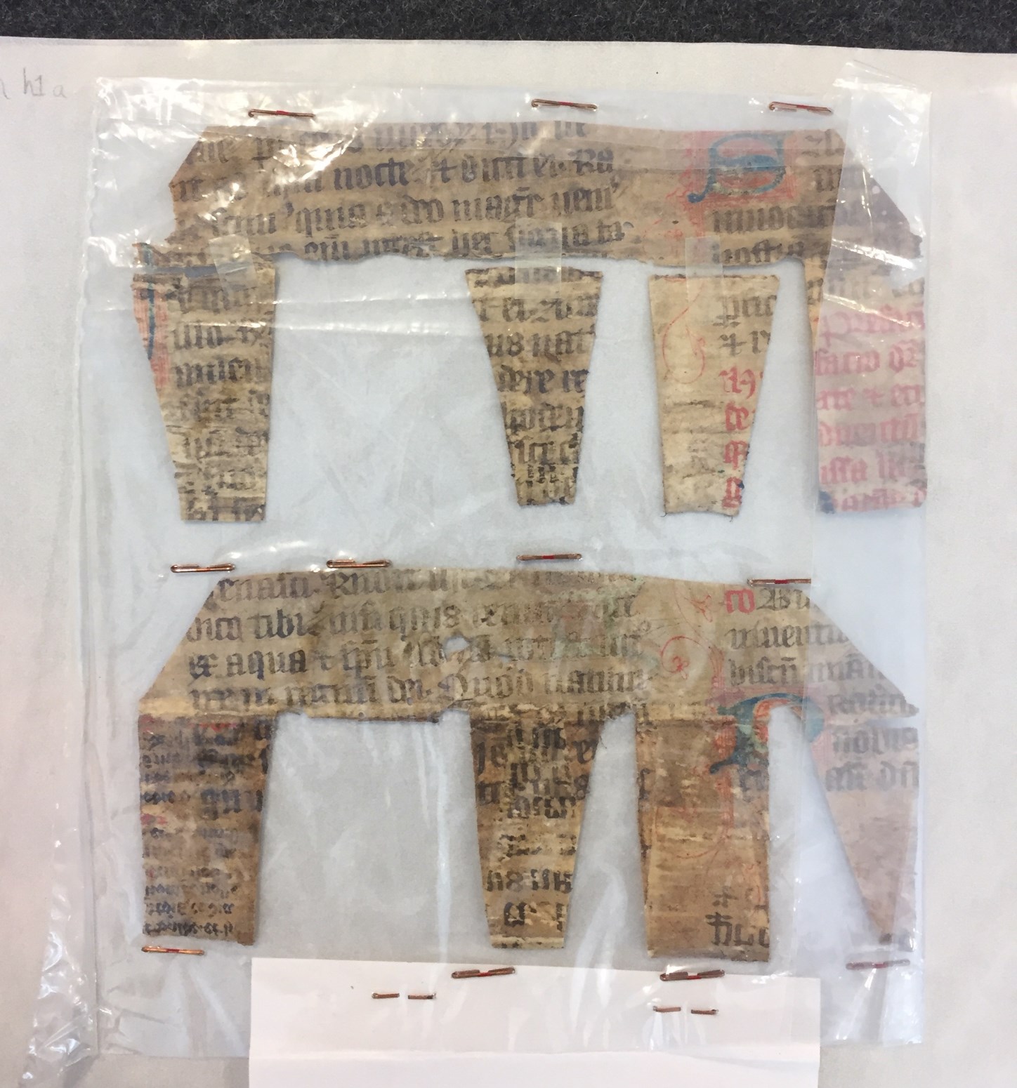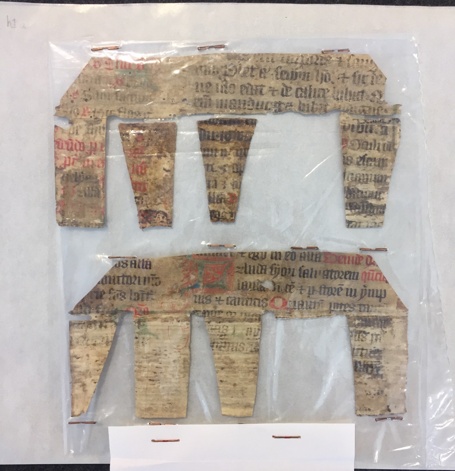 Fragmenten van de band van getijden- en gebedenboek OKM h1, restauratieresten