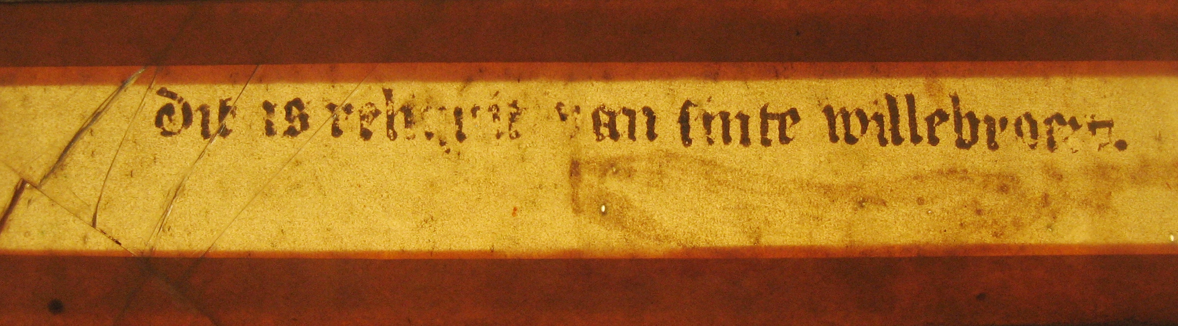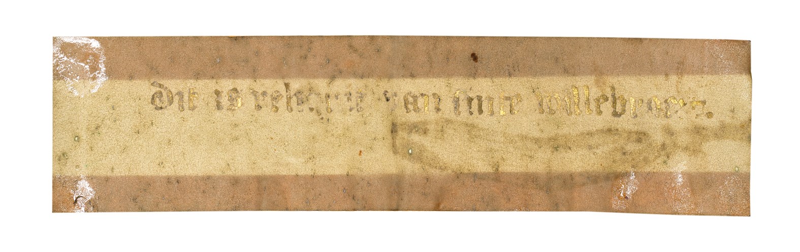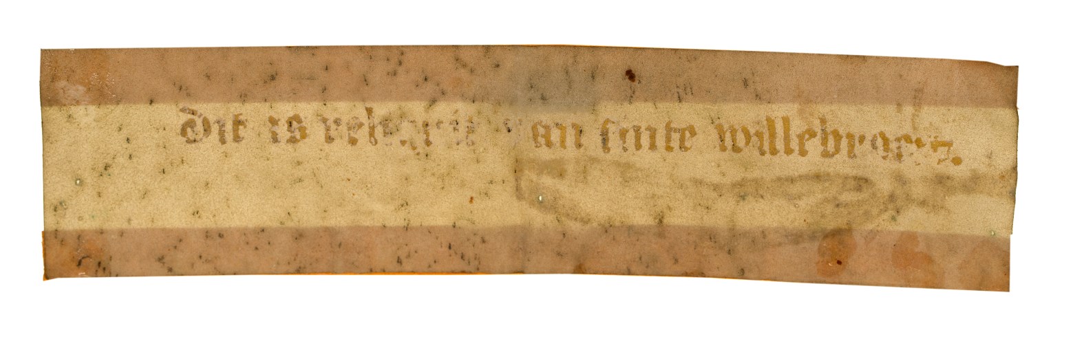 Cedula, reliekenbriefje met als tekst "Dit is reliquie van Sinte Willebroert" behorende bij sandaalreliek van Willibrord