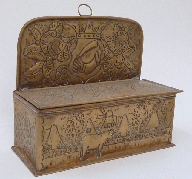 Zwavelstokkendoos, versierd met koe in Hollands landschap, op achterplaat wapenschild