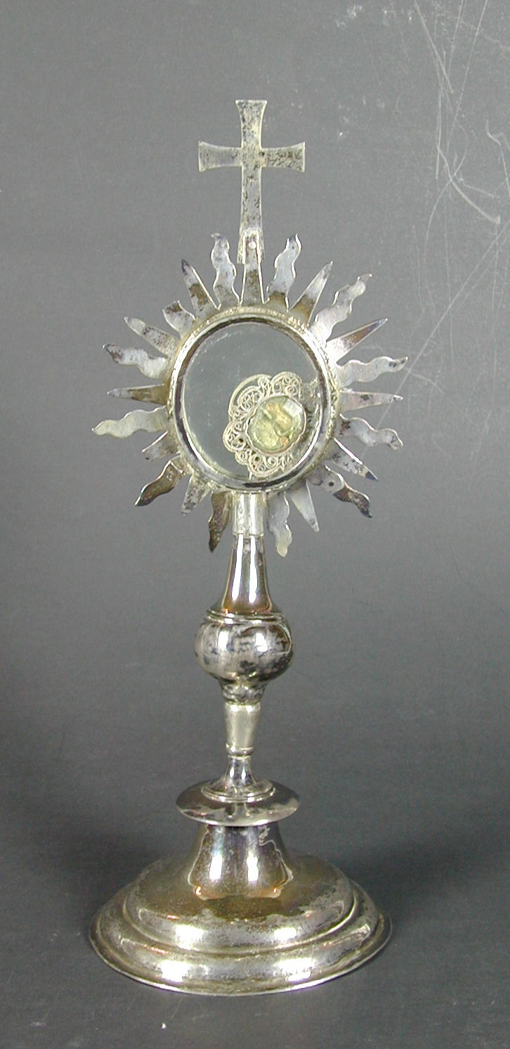 Reliekmonstrans, in ovaal filigraan lijstje, reliek en portret mannelijke heilige