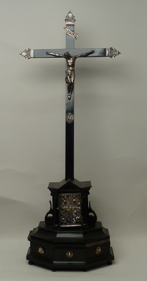 Crucifix op hoekige gelede voet met lade, met opengewerkt zilveren deurtje en zilveren corpus