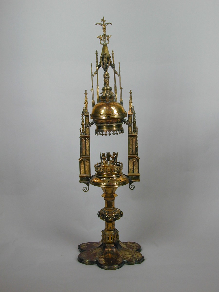 Monstrans op zeslobbige voet, hoekige stam, cylinder geflankeerd door twee pinakeltorentjes