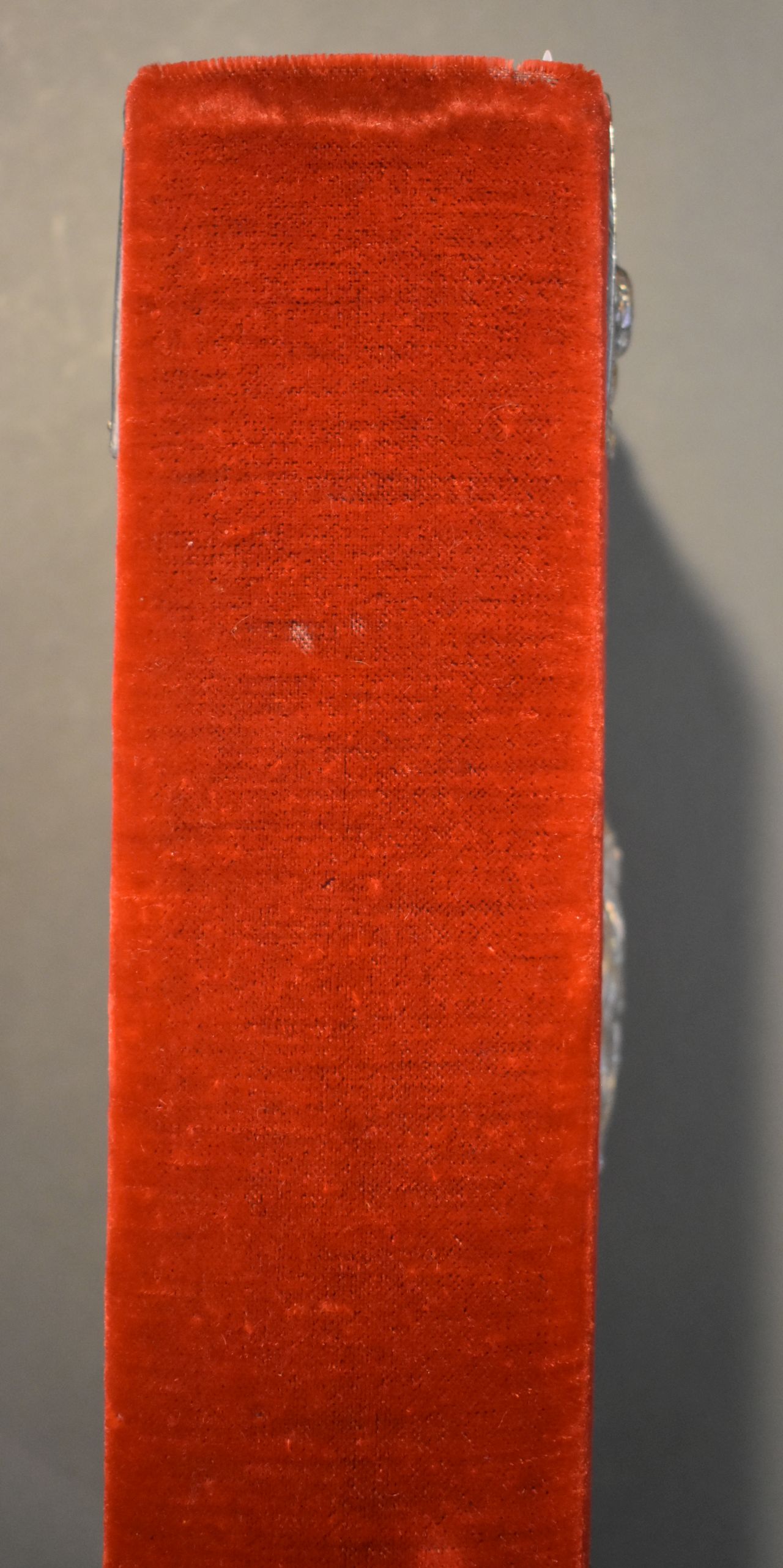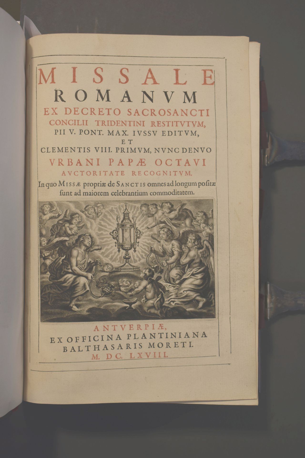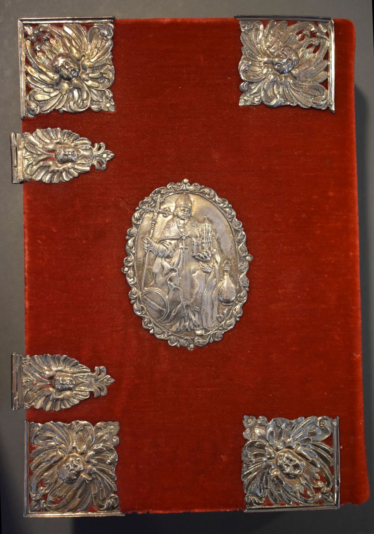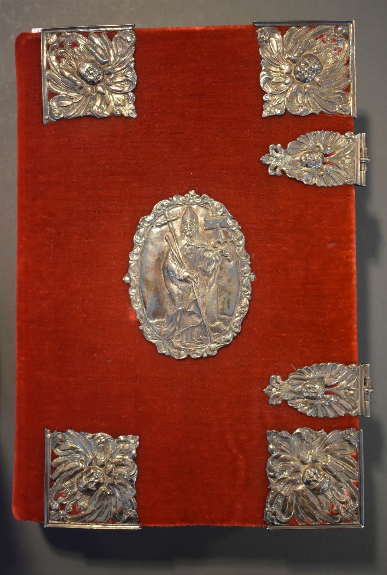 Missale Romanum ex decreto sacrosancti concilii Tridentini restitutum, Pii v. Pont. Max. iussu editum et Clementis VIII. Primum, nunc denvo Urbani papae octavi [...], met zilverbeslag. Het zilverbeslag bestaat uit een medaillon (H. 13.0 x B. 9.5 cm) op voor- en achterzijde waarop H. Willibrordus met kruis en kerk en H. Bonifatius met kruis en ...
