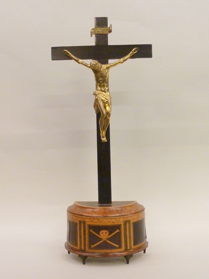 Crucifix met halfcirkelvormige voet, ingelegd met verschillende houtsoorten, koperen corpus
