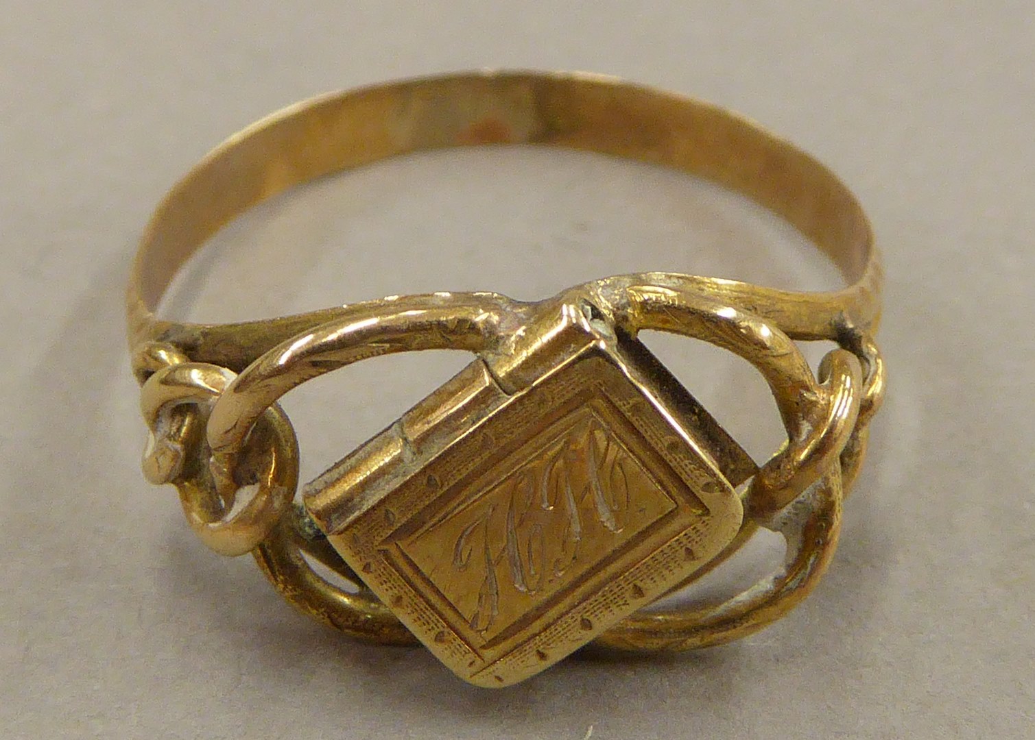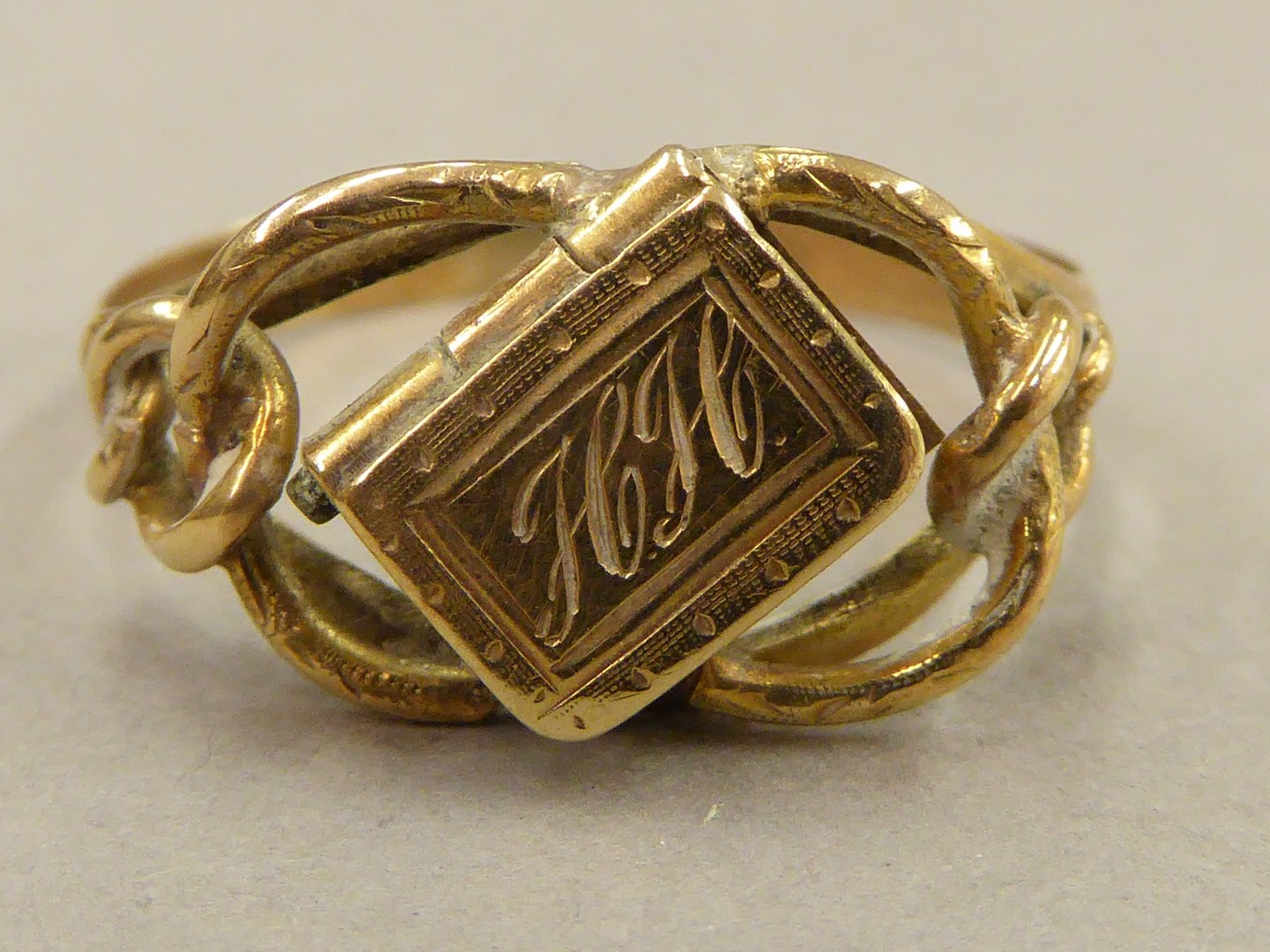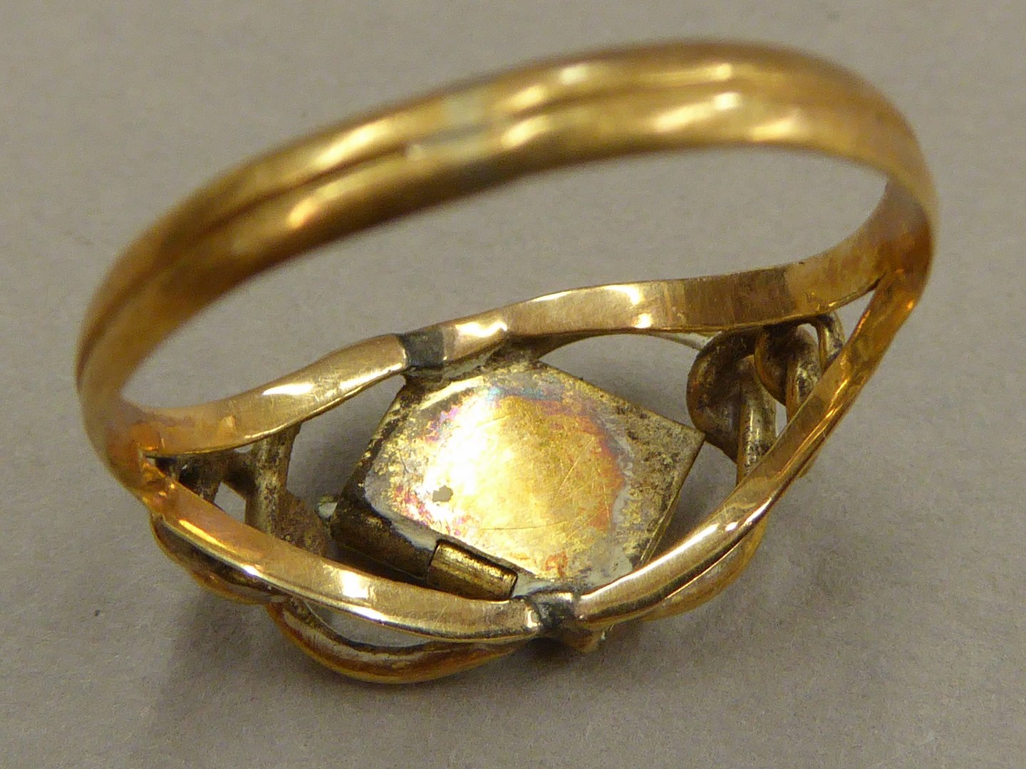 Ring, in open ovaalvorm een overhoeks geplaatst te openen bijbeltje met haarreliek, met "HH", Hermanus Heijkamp(?)