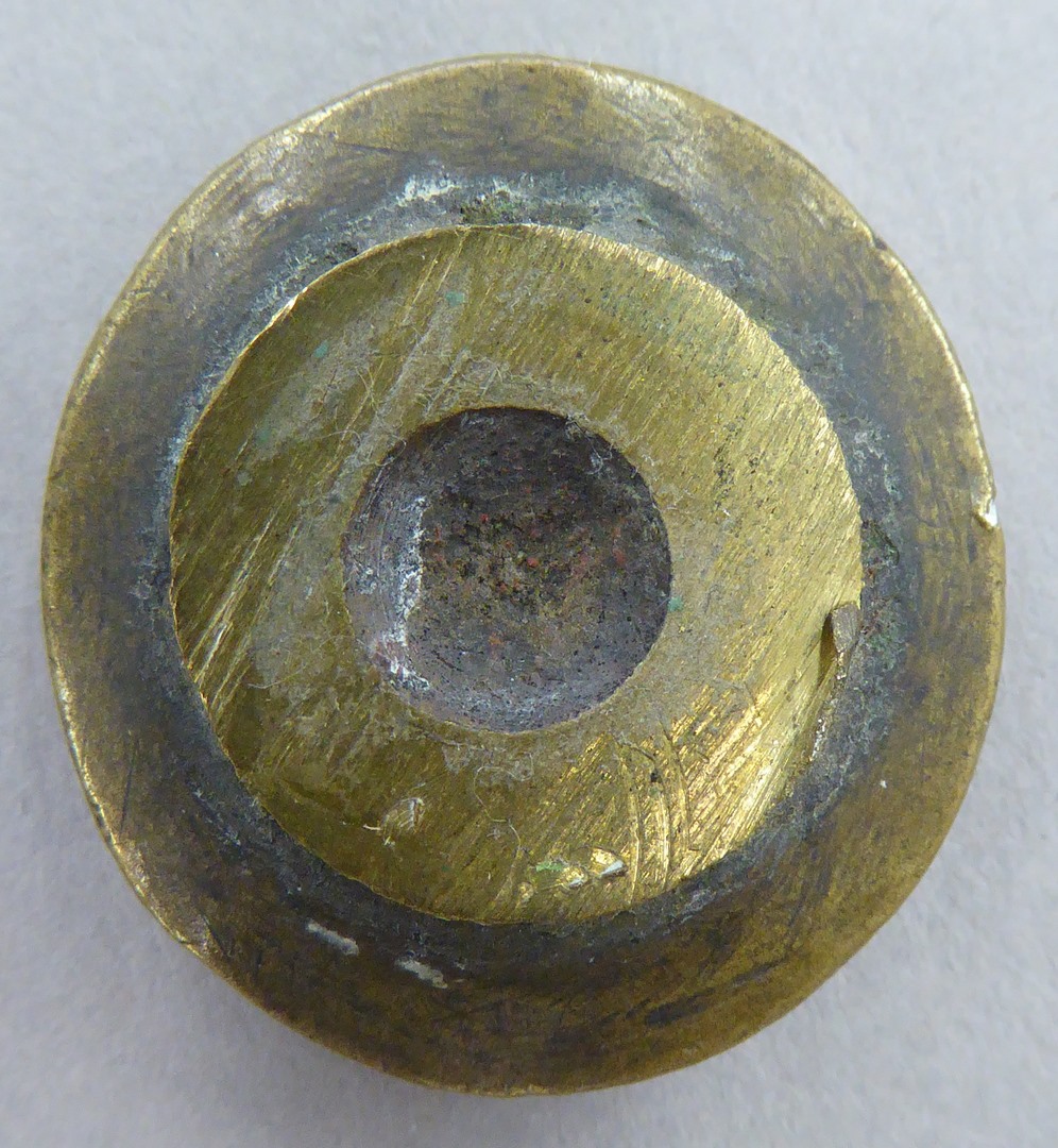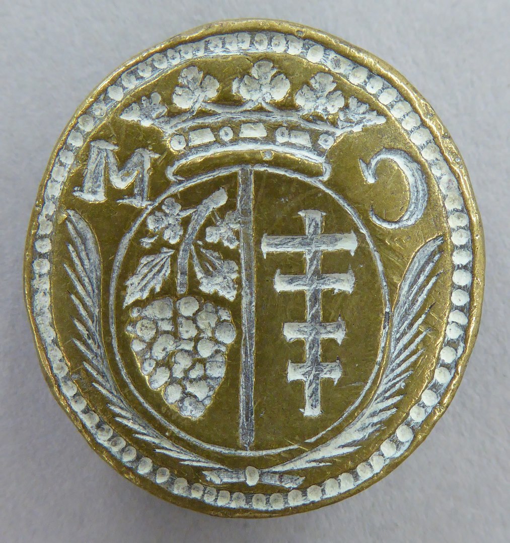 Ovale stempel, waarop gekroond wapenschild met kruis en druiventros, naast kroon "C" en "M"
