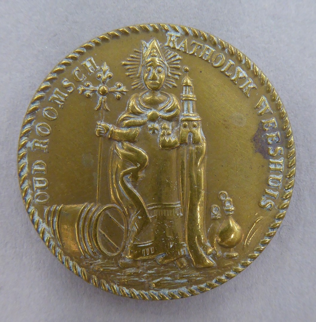 Knoop, rond, met Willibrordus met kerk en staf, met "Oud Roomsch Katholyk Weeshuis"