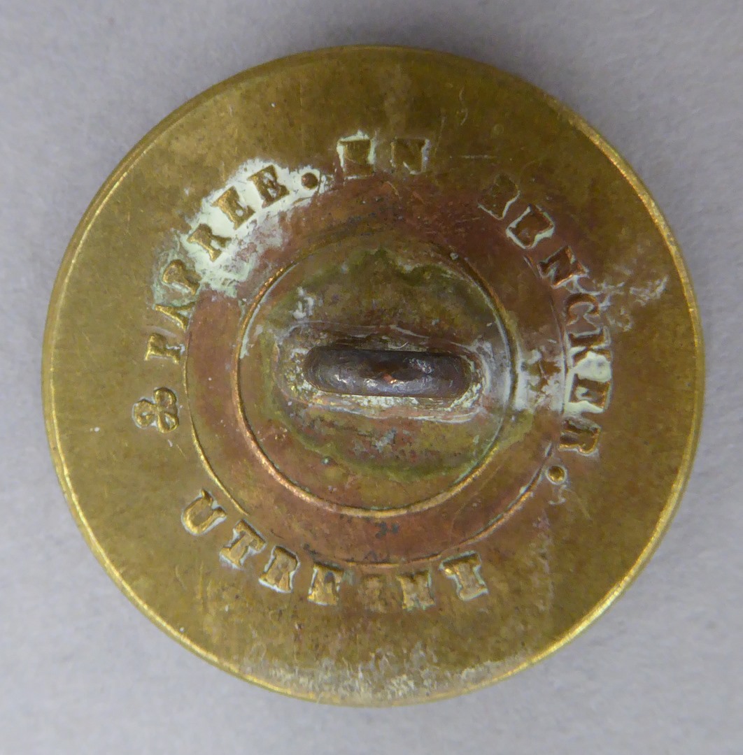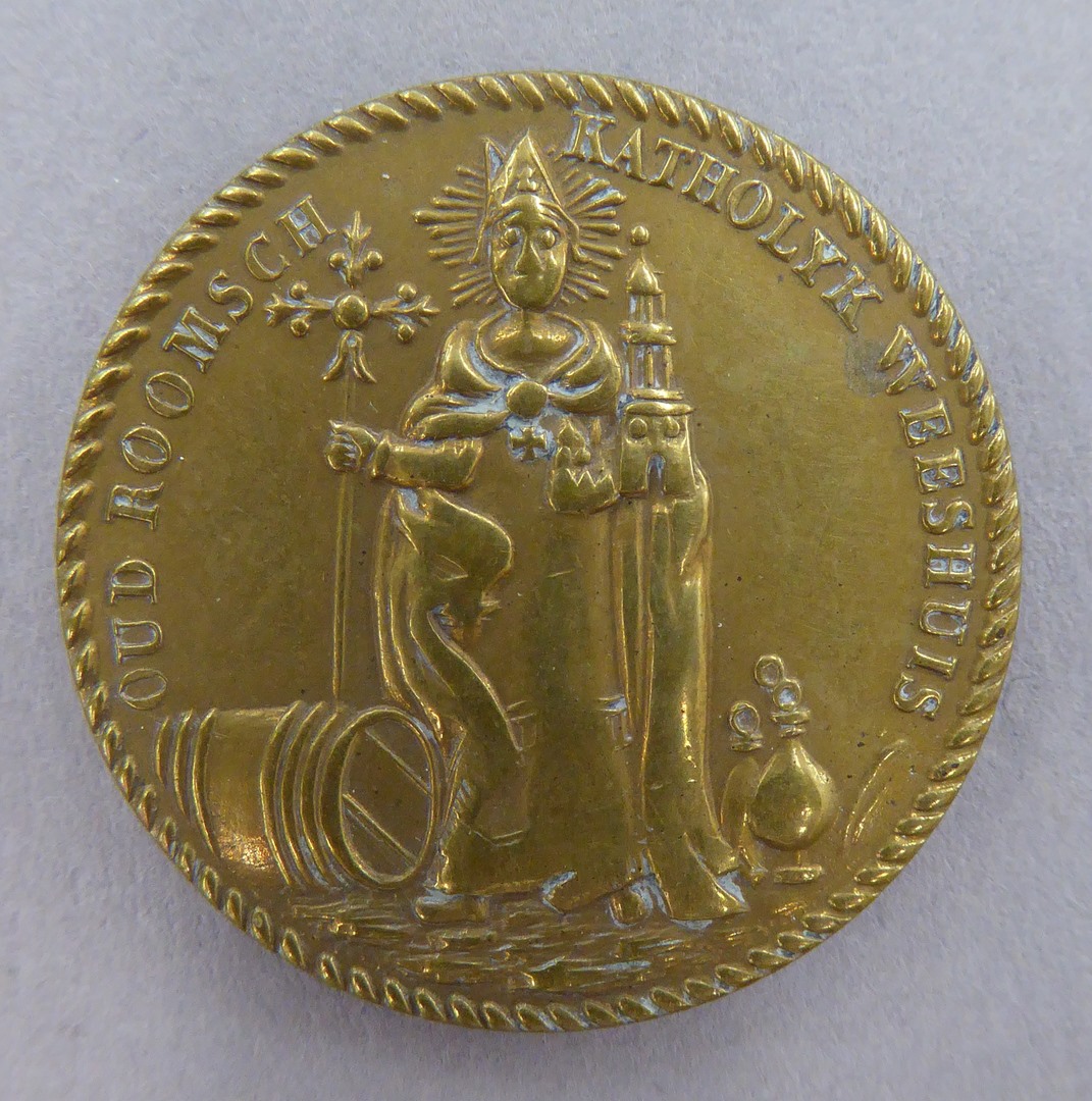 Knoop, rond, met Willibrordus met kerk en staf, met "Oud Roomsch Katholyk Weeshuis"
