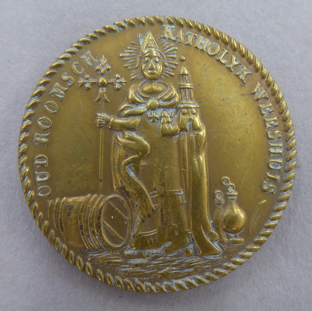 Knoop, rond, met Willibrordus met kerk en staf, met "Oud Roomsch Katholyk Weeshuis"