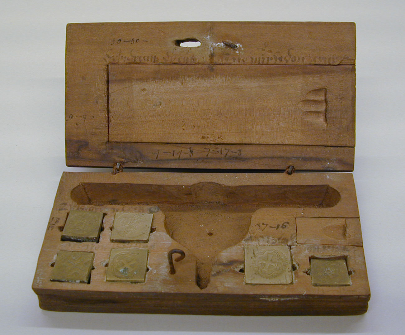 Doosje met gewichten, deksel versierd met bloem- en bladmotieven, zes ruimtes voor gewichten