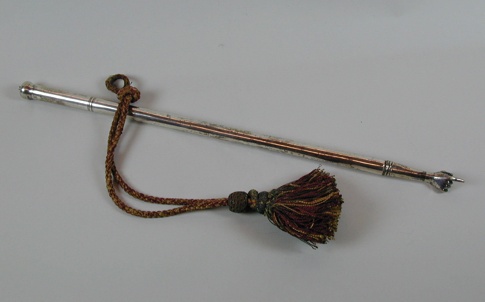 Aanwijshandje met uitgestoken wijsvinger en lange steel, met twee kwasten