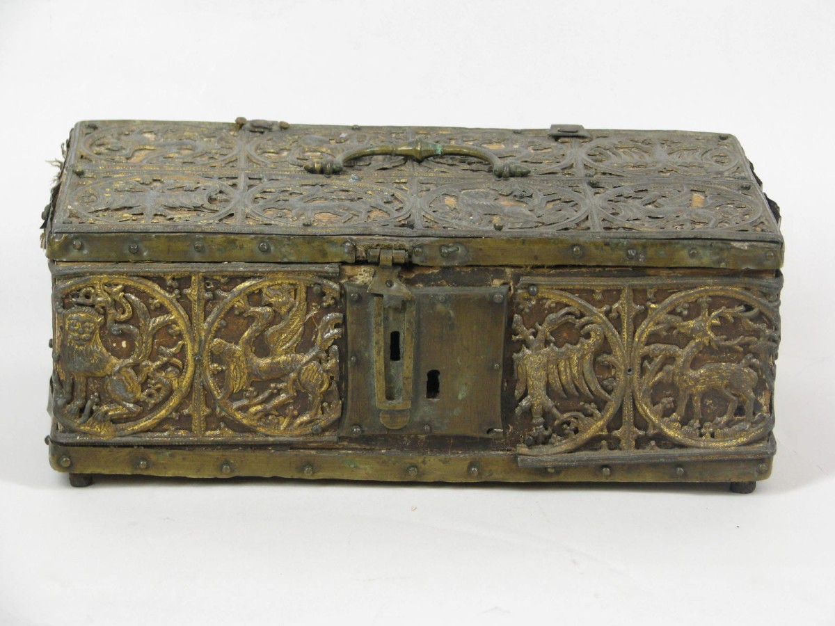 Kistje, eikenhouten kern, met voorstellingen van dubbele adelaar, hert, leeuw tussen eenhoorn, enz.