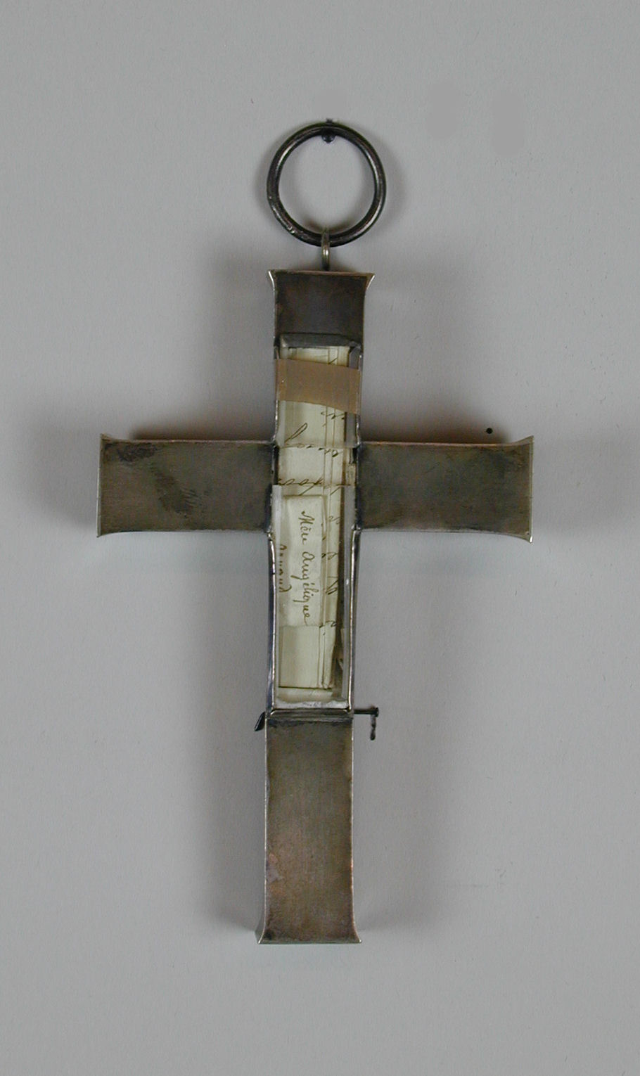 Reliekkruis zonder versiering, achter glas o.a. reliek van mère Marie Angelique Arnauld, abdis van Port-Royal