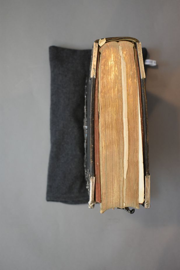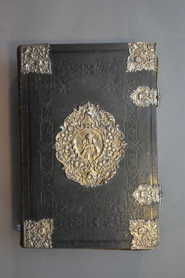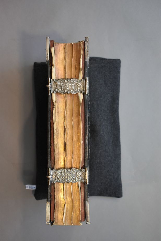 Het boek heeft in ieder geval een gegraveerde titelpagina, het naaisel is gebroken waardoor verschillende bladen los zitten en het eerste katern niet meer vast zit aan de rest van het boekblok en de snede is verguld. Tussen de boekblok en de bad zijn dikke platen bevestigd. De band van zwart leer is versierd met ...
