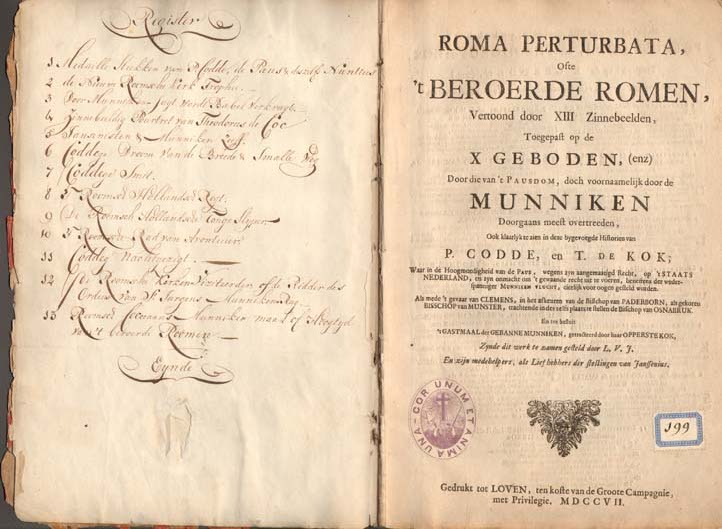 Roma perturbata, ofte 't Beroerde Romen, vertoond door XIII zinnebeelden, toegepast op de X geboden, door die van 't pausdom, doch voornaamelijk door de munniken doorgaans meest overtreeden, ook klaarlijk te zien in deze bygevoegde historien van P. Codde, en T. de Kok [...] voor oogen gesteld worden [...] (1707)