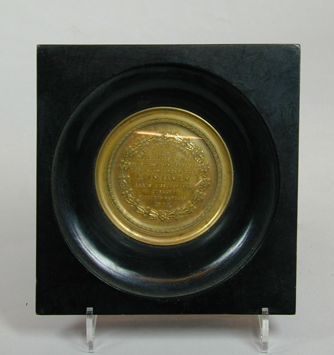 Ingelijste gedenkpenning 50-jarig priesterfeest Mgr. J. van Santen, aartsbisschop van Utrecht, opschrift