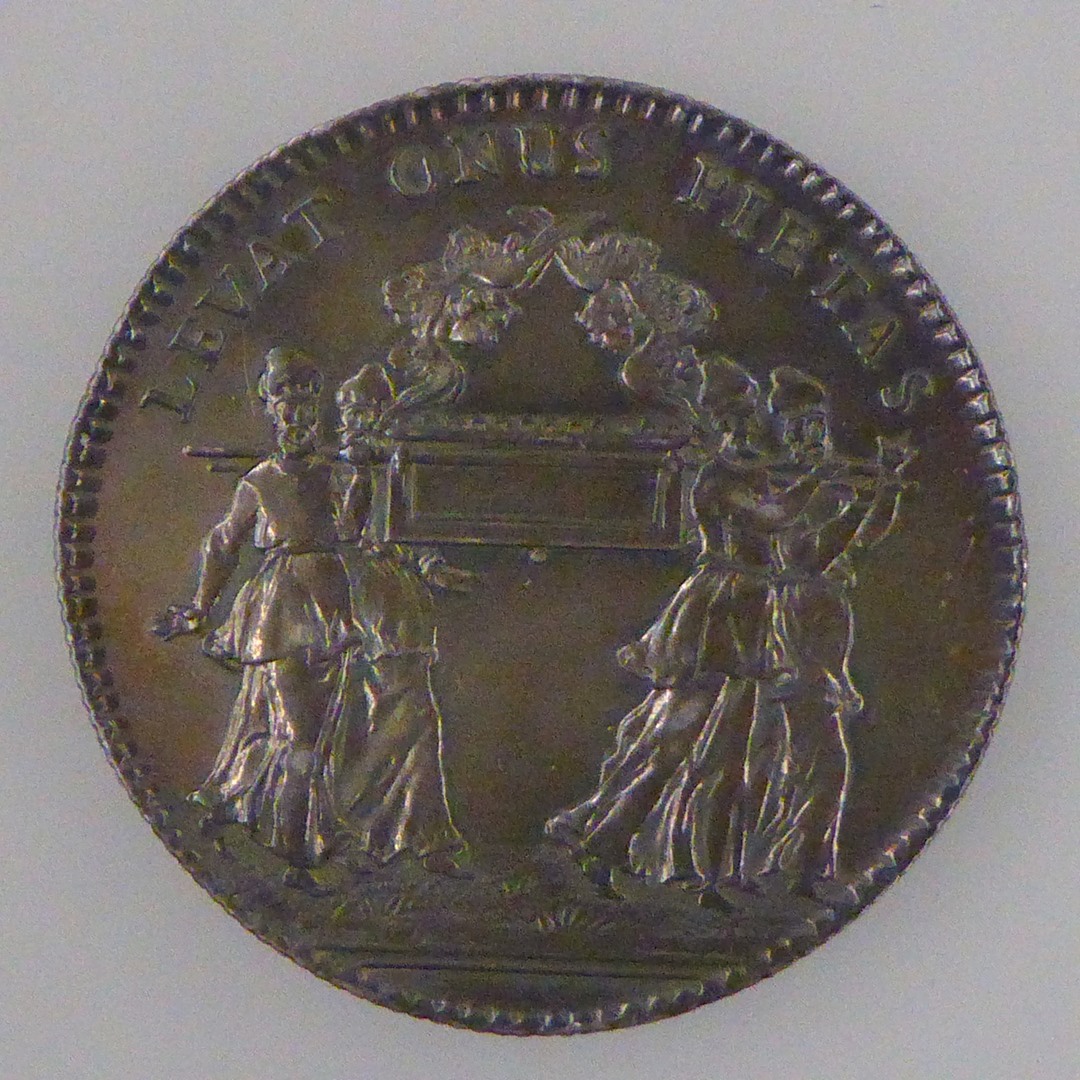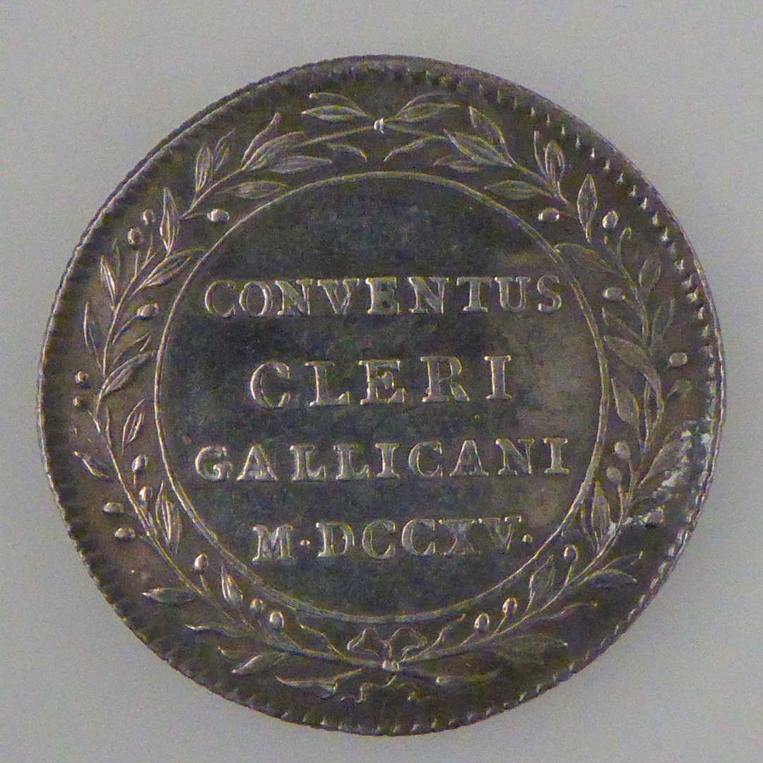 Gedenkpenning Conventus Cleri Gallicani 1715 met opschrift, kz. vier priesters met ark des verbonds