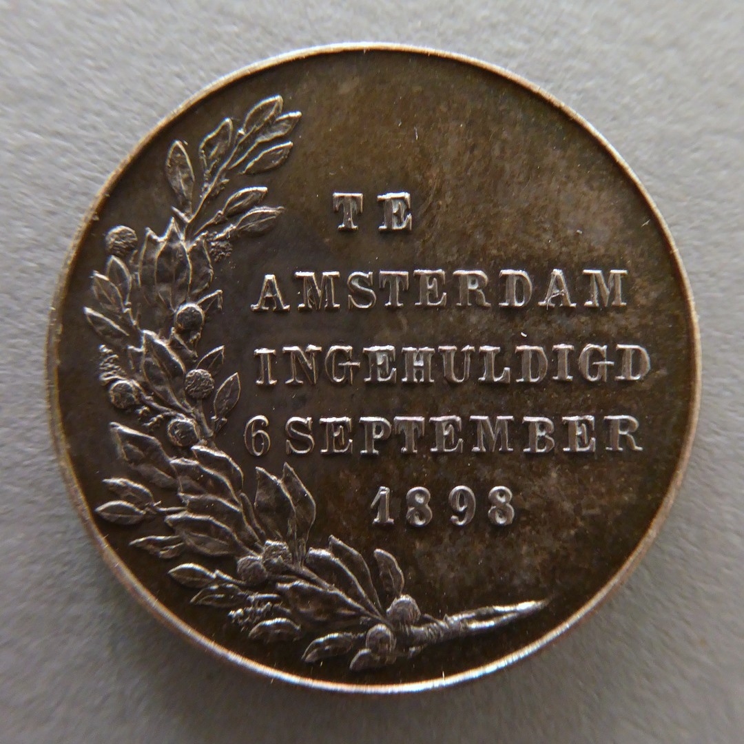 Gedenkpenning inhuldiging koningin Wilhelmina 1898, met portret, kz. lauwertak en opschrift