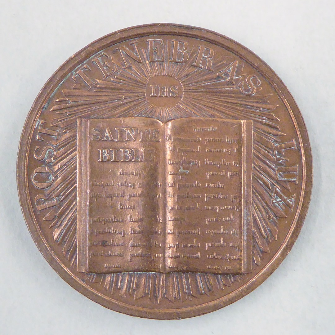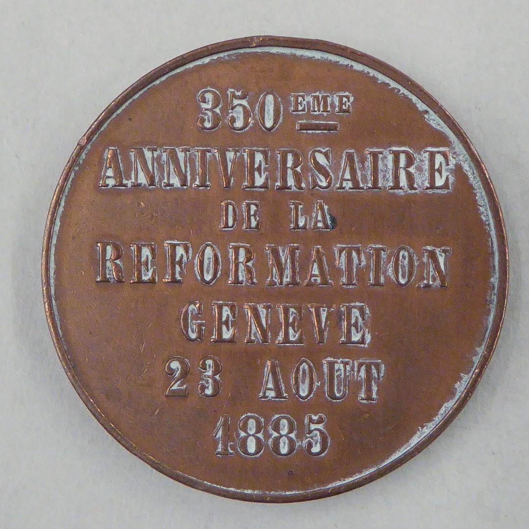 Herinneringspenning 350ste verjaardag hervorming van Genève, met bijbel, kz. opschrift