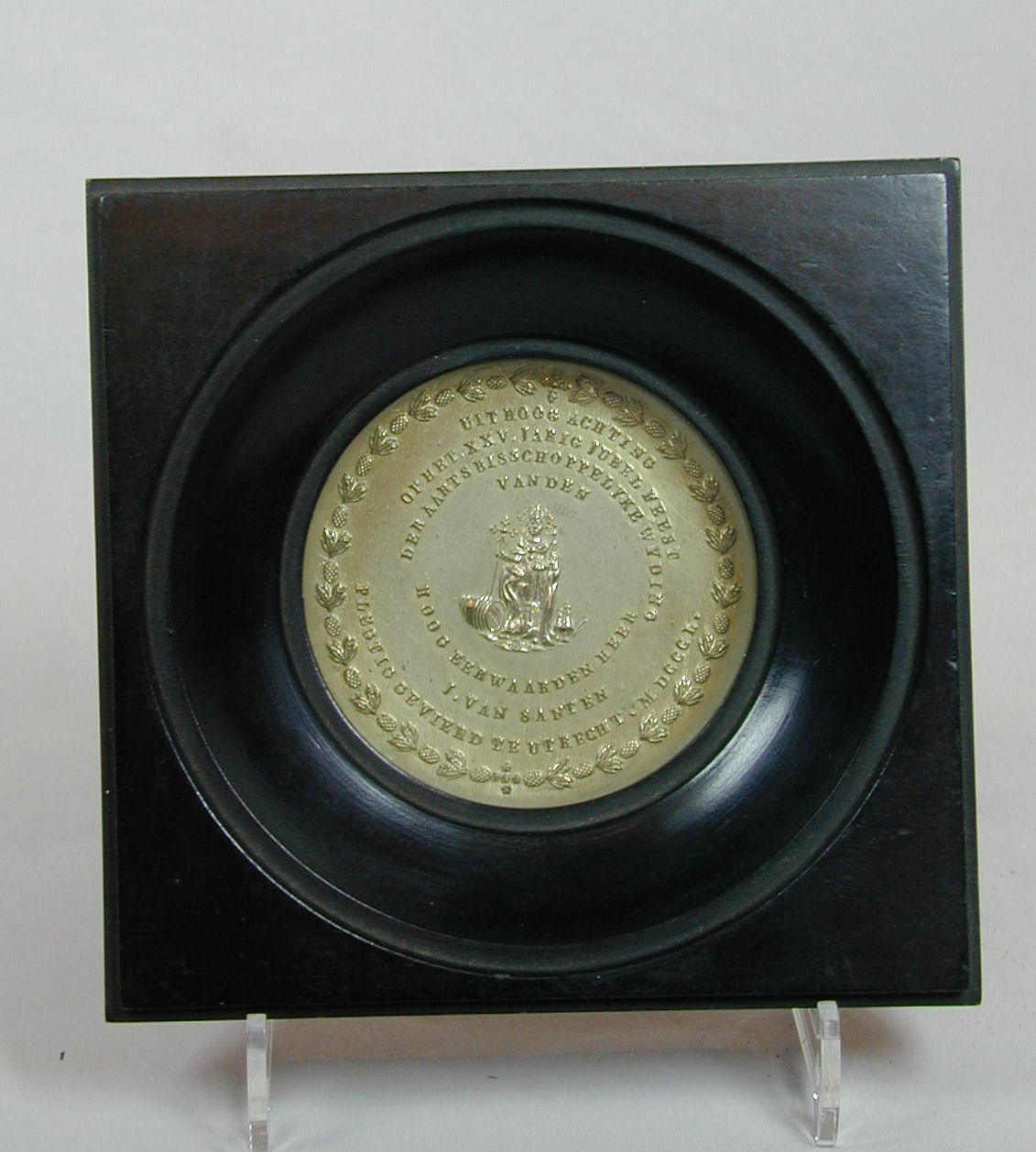 Gedenkpenning 25-jarig jubelfeest aartsbisschoppelijke wijding Mgr. J. van Santen, in lijst