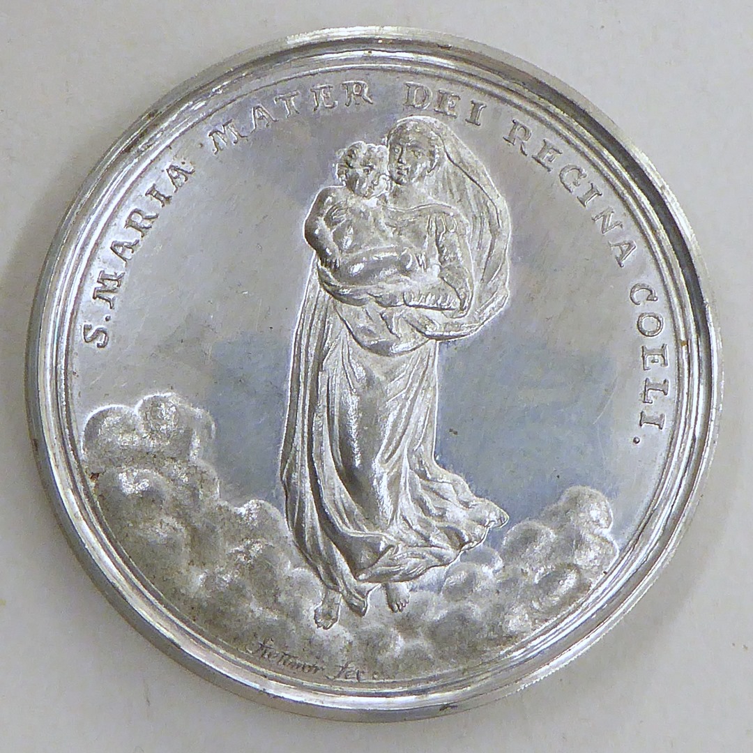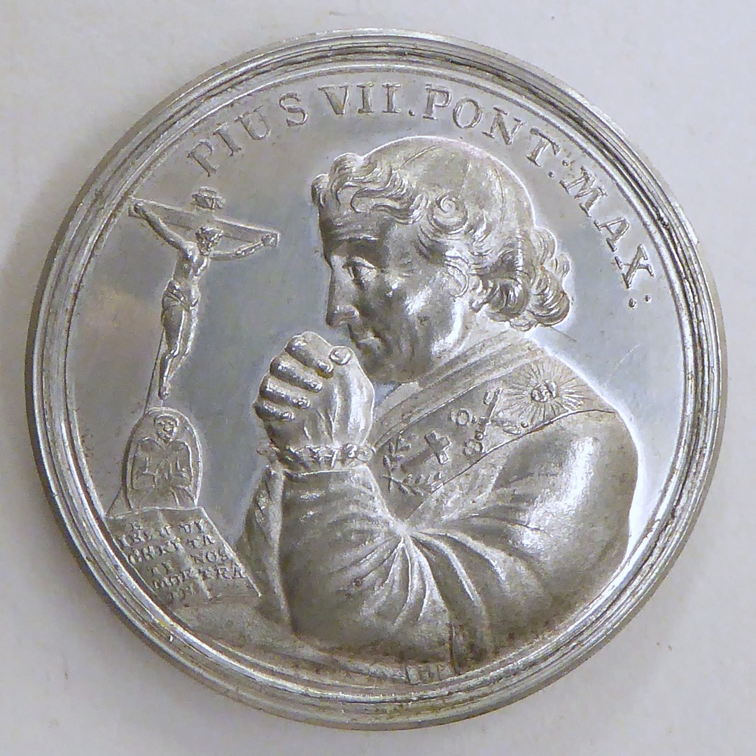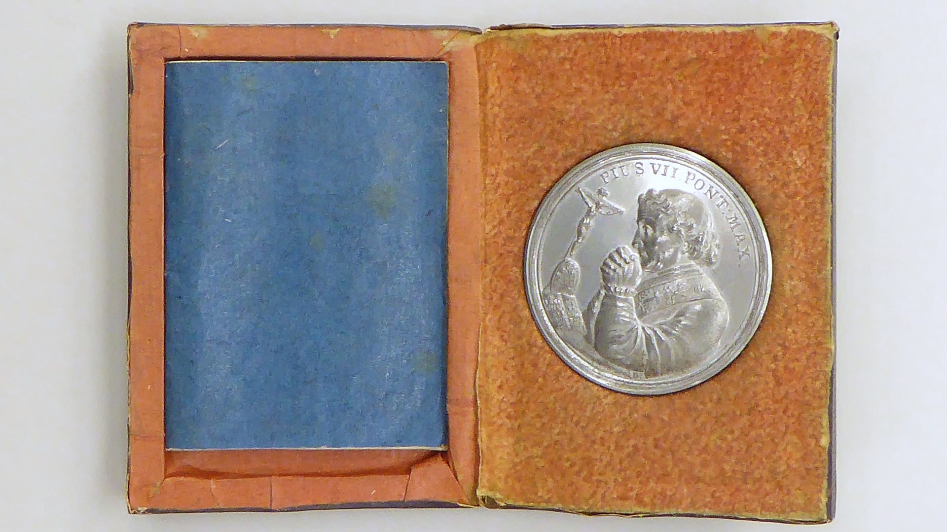 Schroefpenning met portret paus Pius VII, met zestien Duitse prentjes, in foedraal met boekje