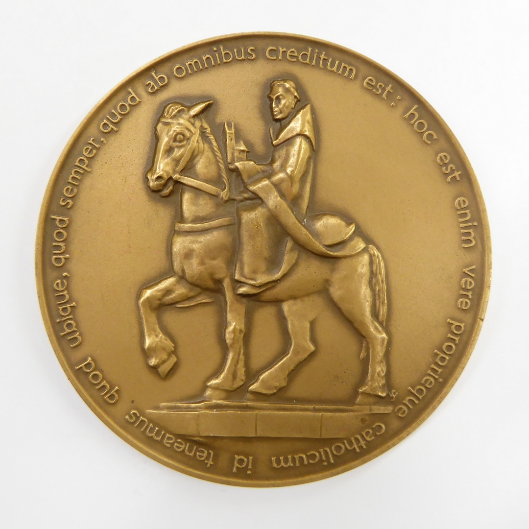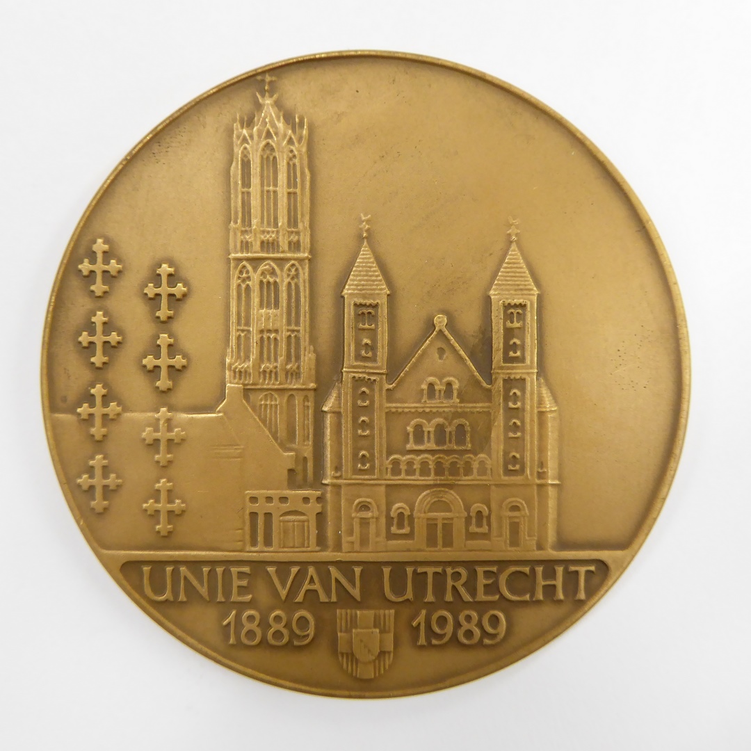 Gedenkpenning 100-jarig bestaan Unie van Utrecht met Gertrudiskathedraal en Dom, kz. Willibrord