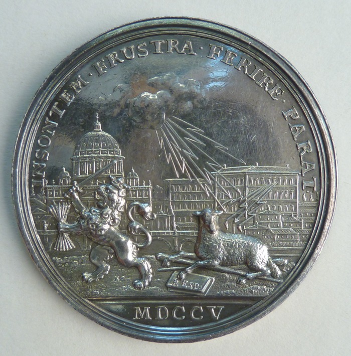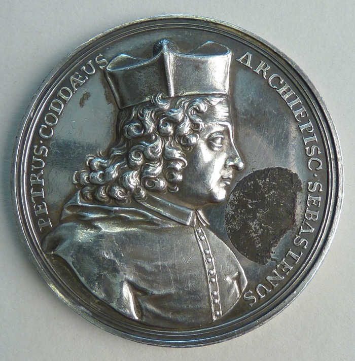 Gedenkpenning met portret Petrus Codde, kz. lam (Codde) beschermd door Nederlandse leeuw