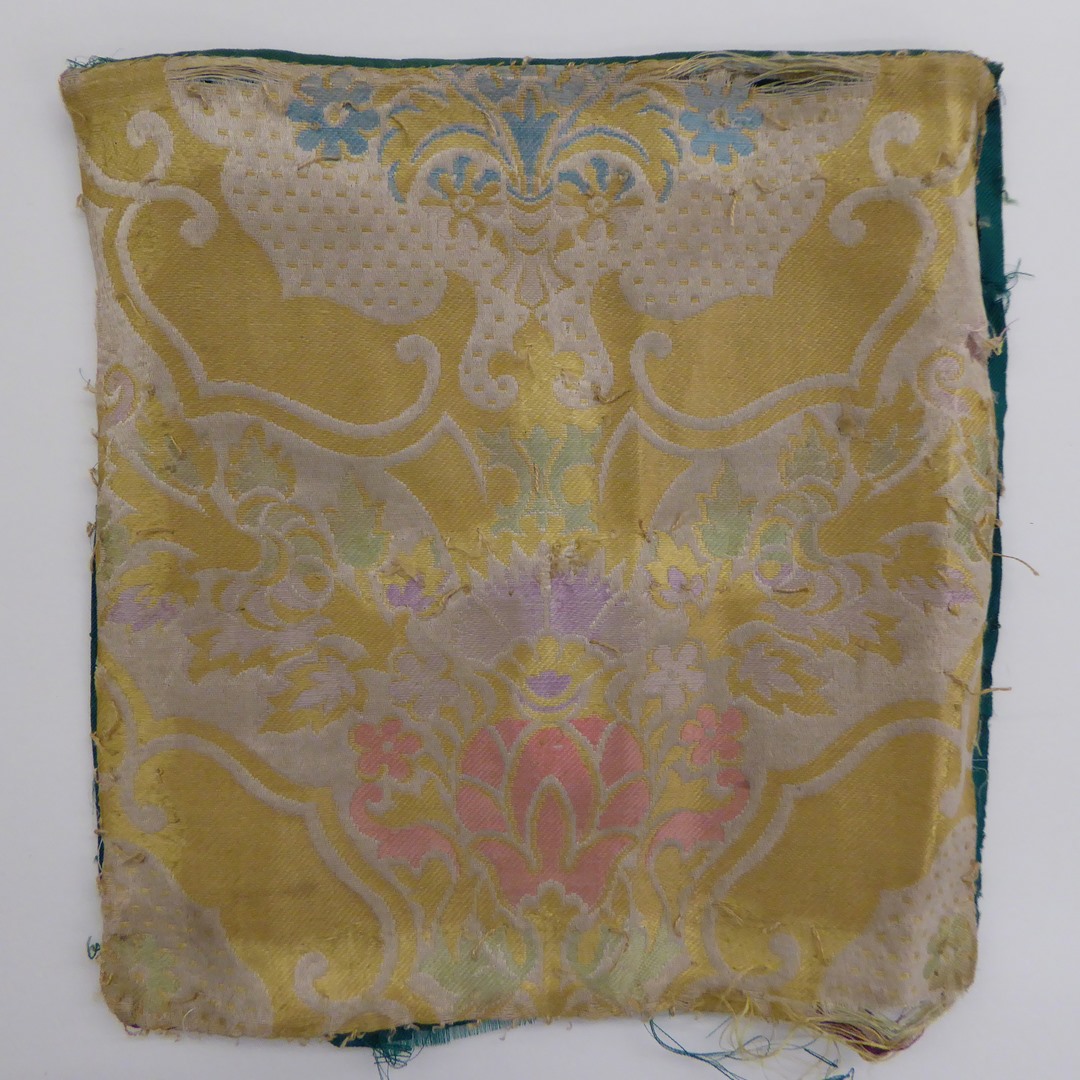 Gele lampas met gekleurde granaatappelmotieven, met stuk groene zijde eraan