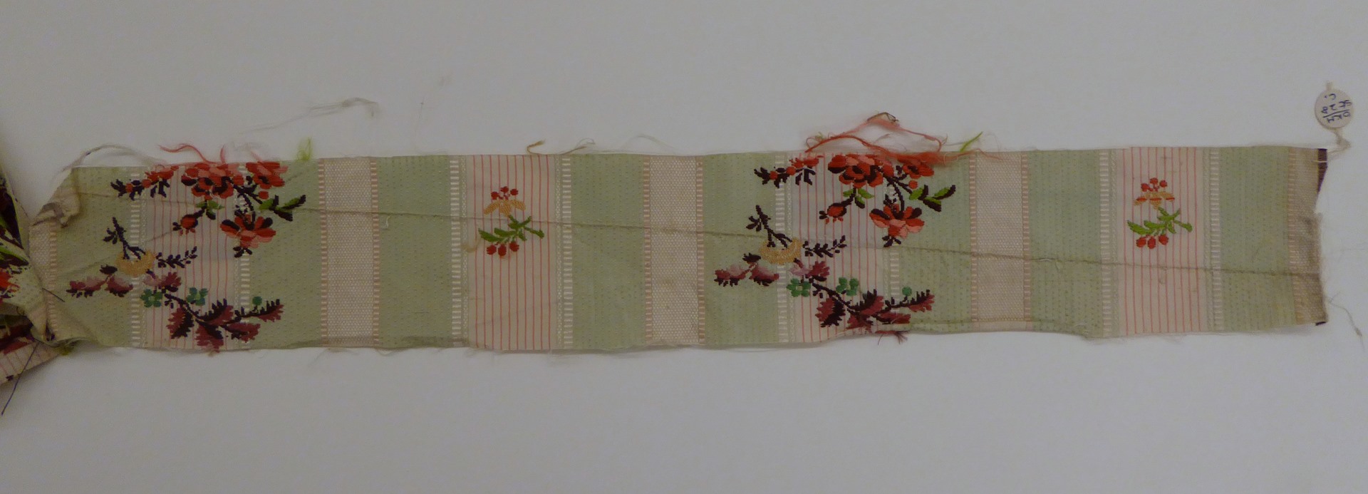 Pekin, groen, roze, rood gestreept met strooibloemen en boeketten