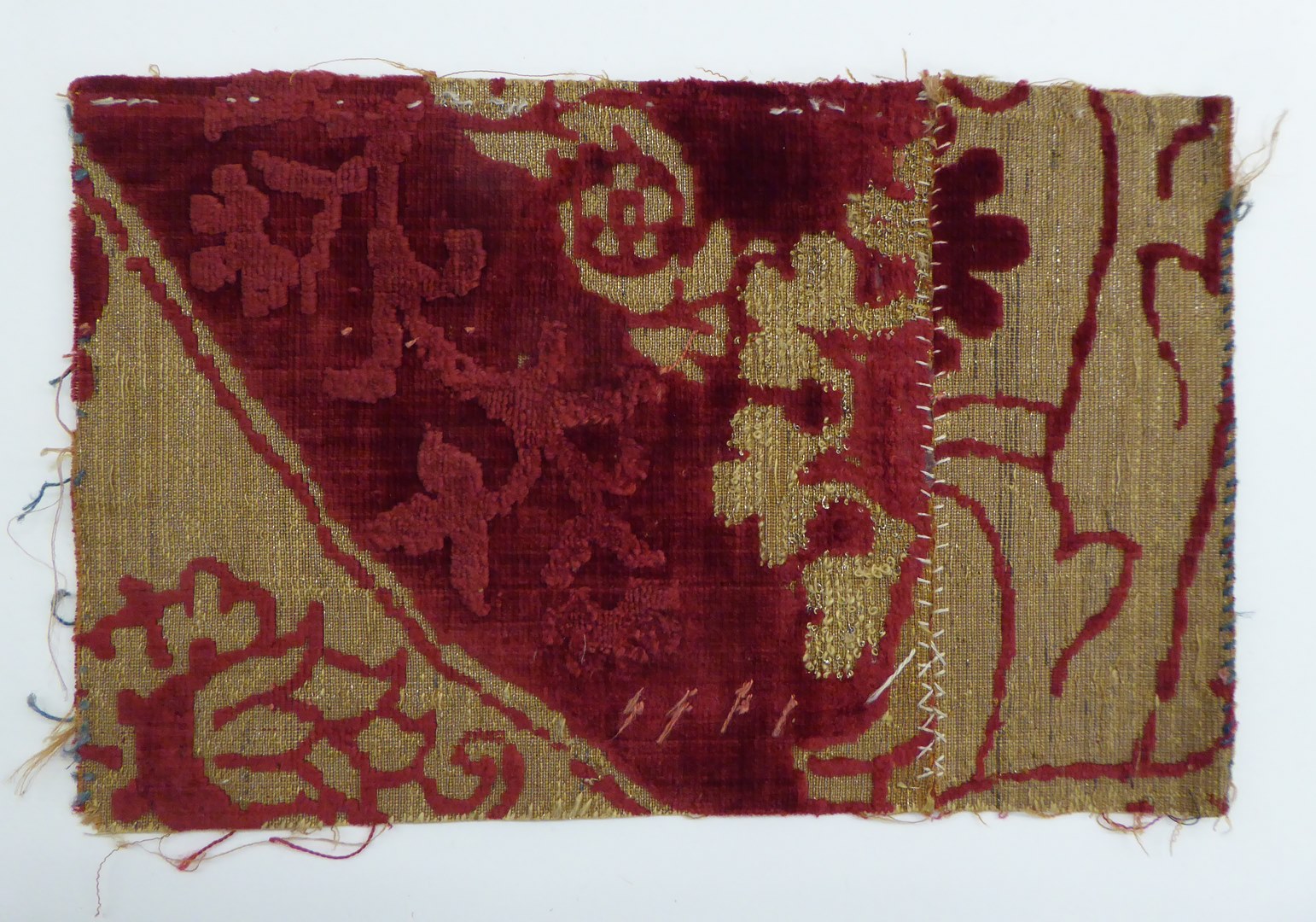 Goud, effen, gekruifd fluweel met rood granaatappelpatroon